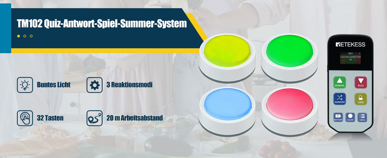 Das TM102 ist ein Buzzer-System für Spiele. Es verfügt über farbige Lichter und ist einfach zu bedienen. Drei Spielmodi stehen zur Auswahl. Ideal für Schule, Familienspiele, Treffen mit Freunden, Firmenspiele und vieles mehr.