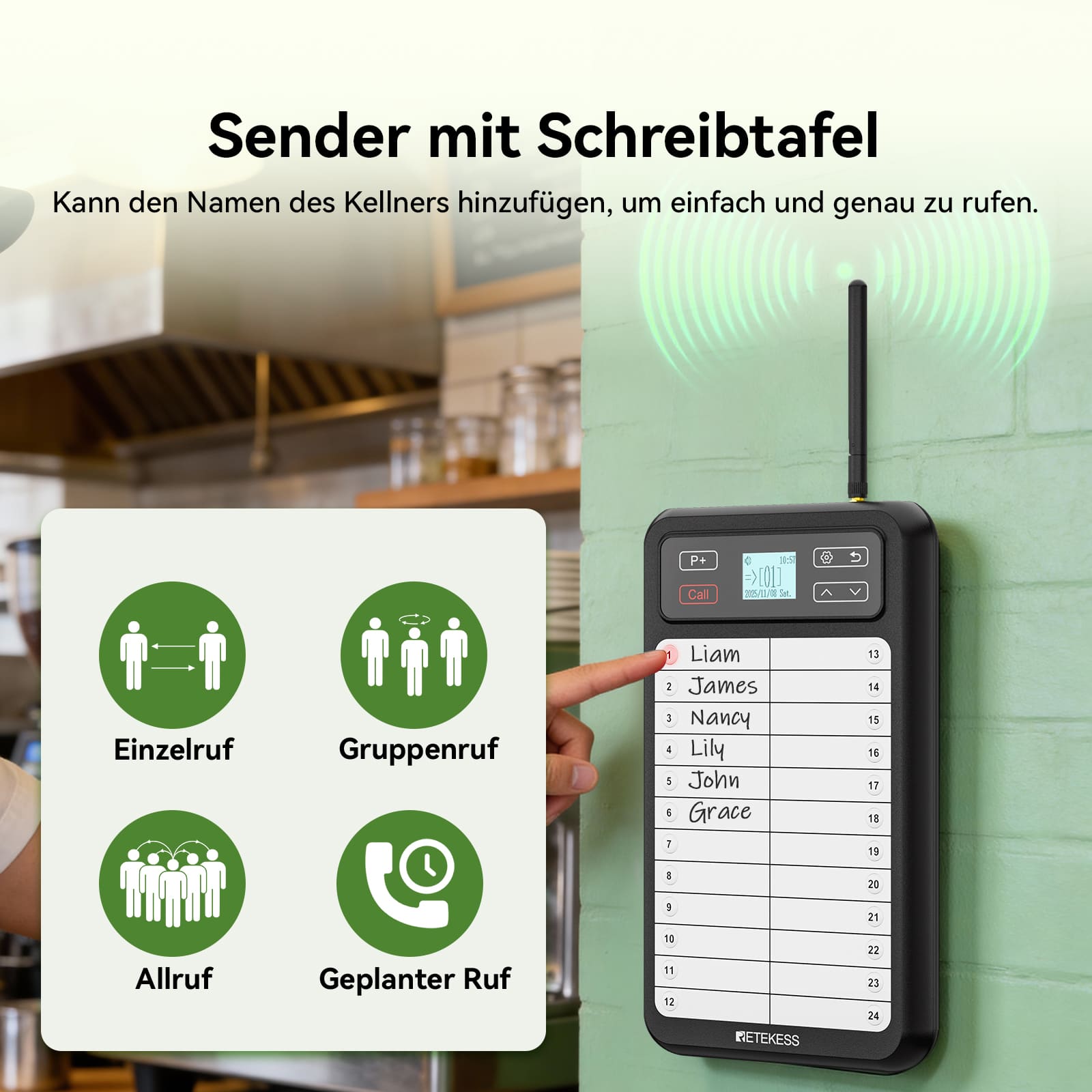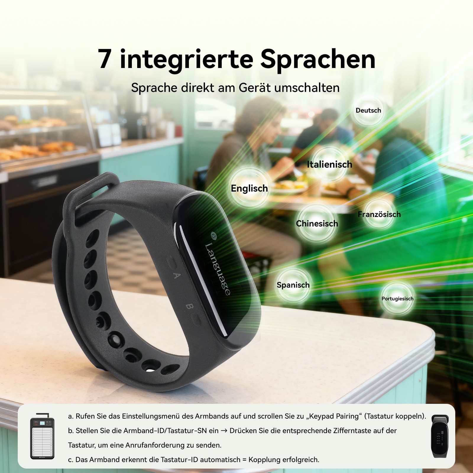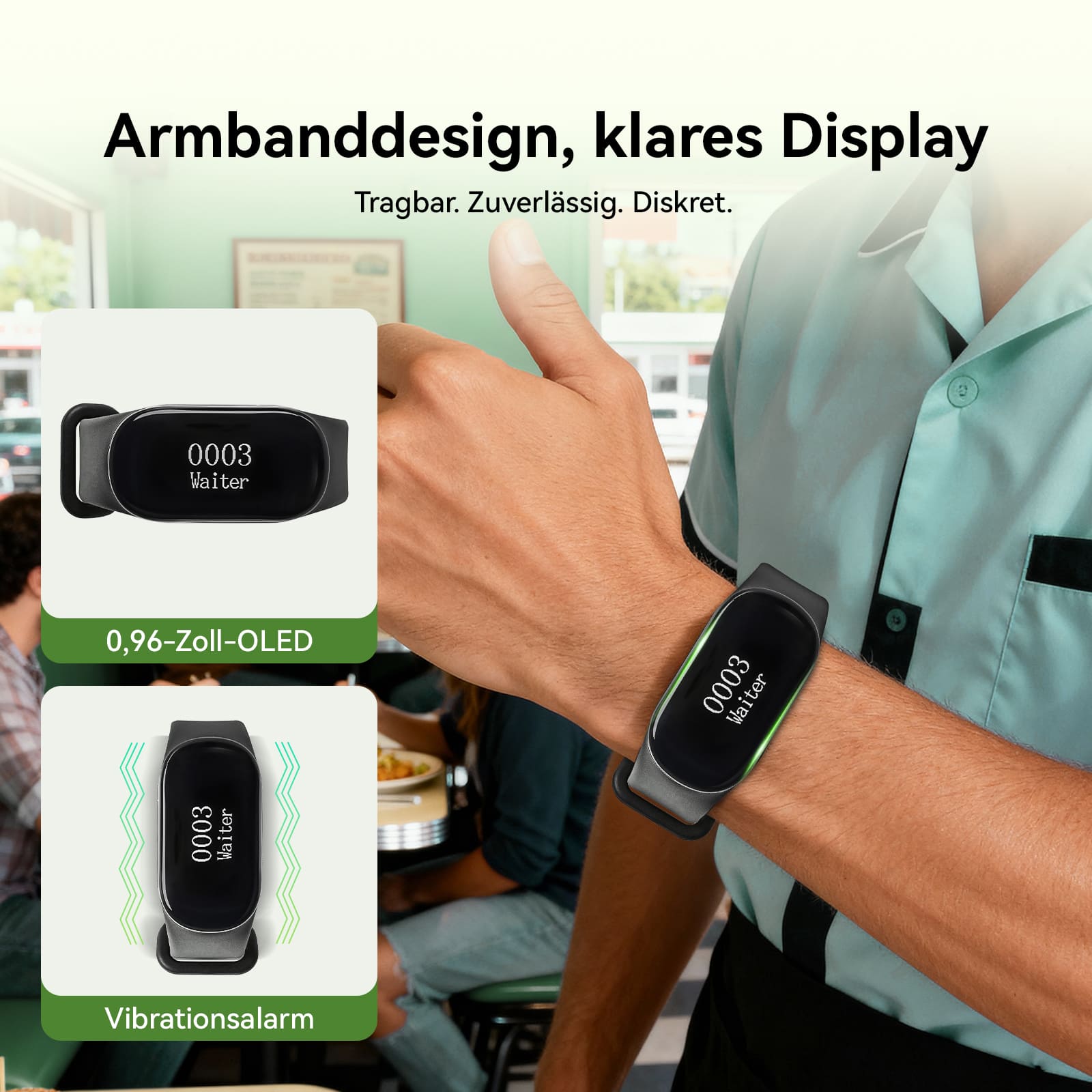 Dieses Pagersystem für Restaurantmitarbeiter verfügt über einen per USB aufladbaren Handgelenkempfänger mit einer Reichweite von über 800 Metern und unterstützt bis zu 99 Empfänger. Es bietet anpassbare Anrufmodi, Vibrationsalarme und ist wasserdicht (IPX7). Mit einem beschreibbaren Sender mit weißem Schreibfeld, mehrsprachiger Unterstützung und langer Akkulaufzeit ist es die ideale Lösung für die reibungslose Zusammenarbeit Ihrer Mitarbeiter
