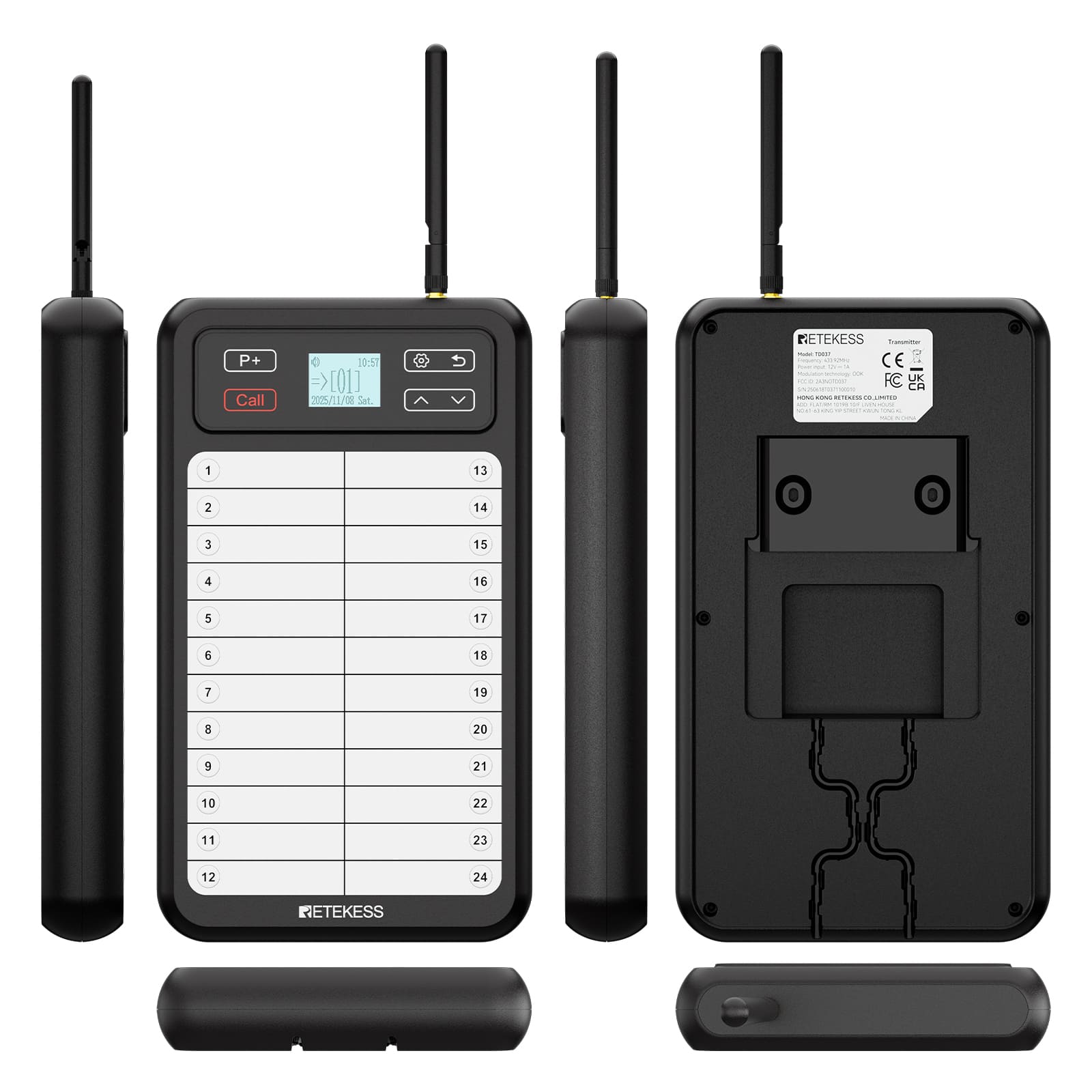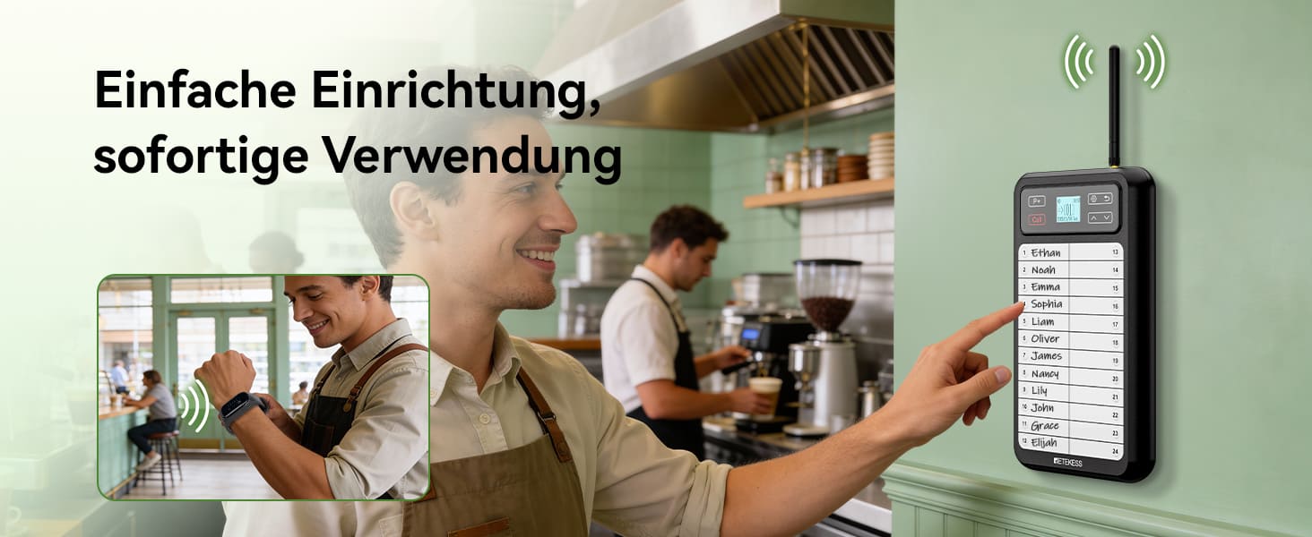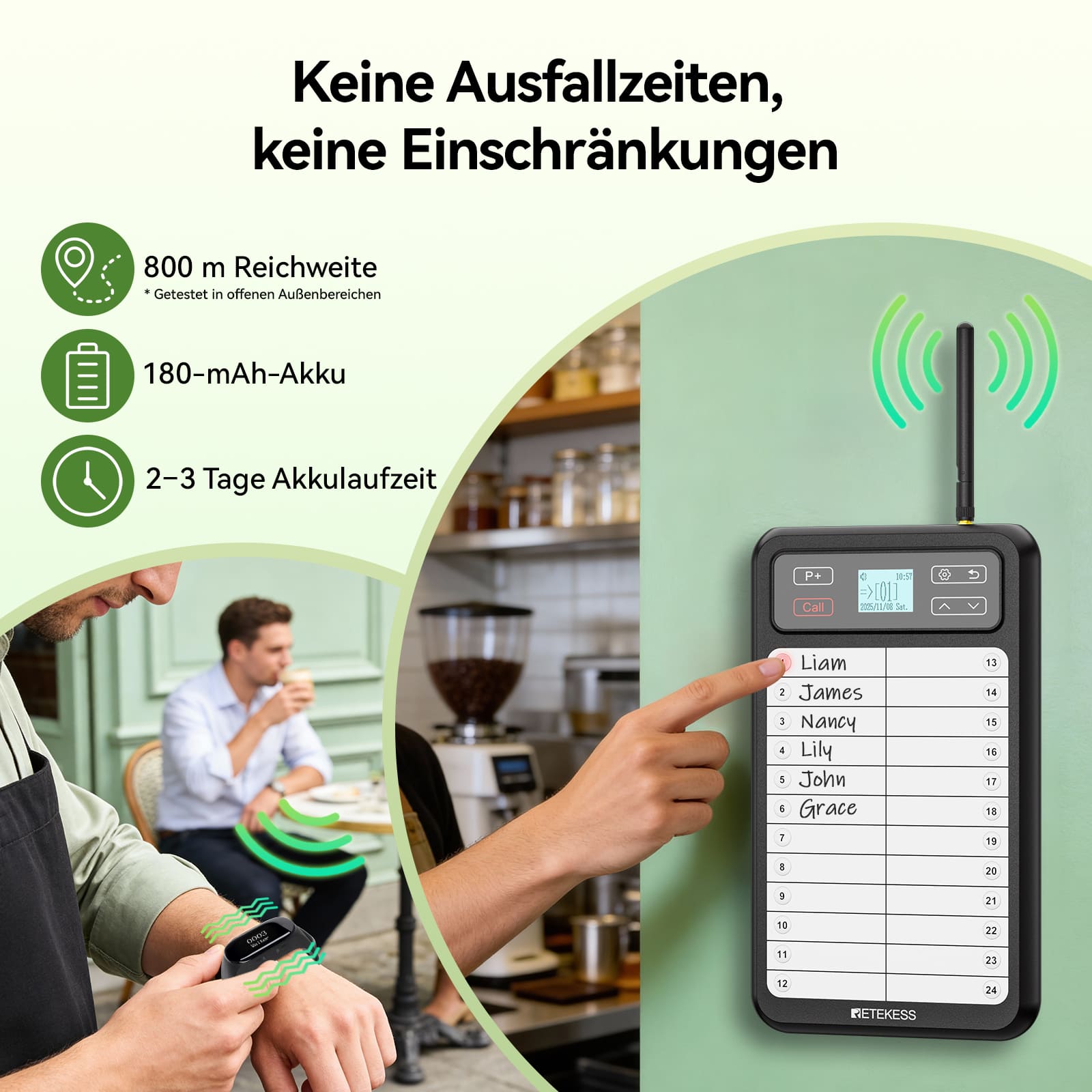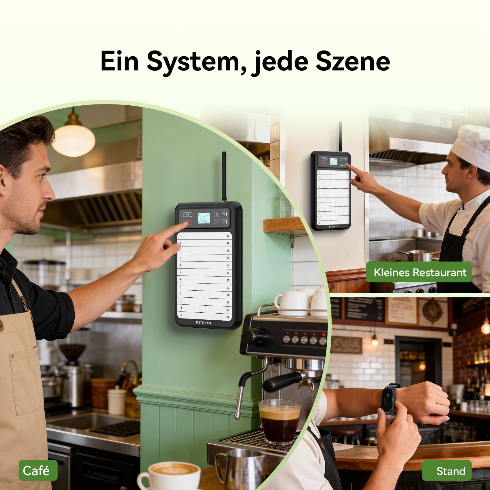 Dieses Pagersystem für Restaurantmitarbeiter verfügt über einen per USB aufladbaren Handgelenkempfänger mit einer Reichweite von über 800 Metern und unterstützt bis zu 99 Empfänger. Es bietet anpassbare Anrufmodi, Vibrationsalarme und ist wasserdicht (IPX7). Mit einem beschreibbaren Sender mit weißem Schreibfeld, mehrsprachiger Unterstützung und langer Akkulaufzeit ist es die ideale Lösung für die reibungslose Zusammenarbeit Ihrer Mitarbeiter