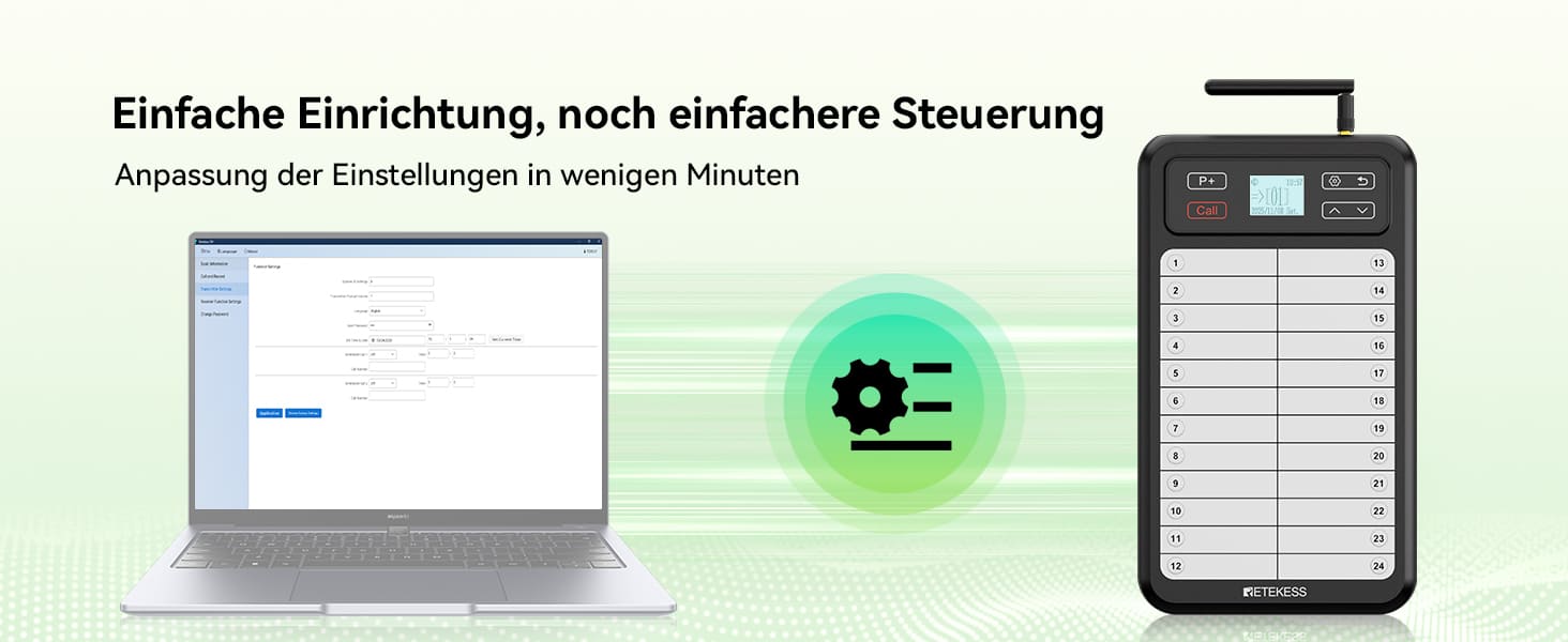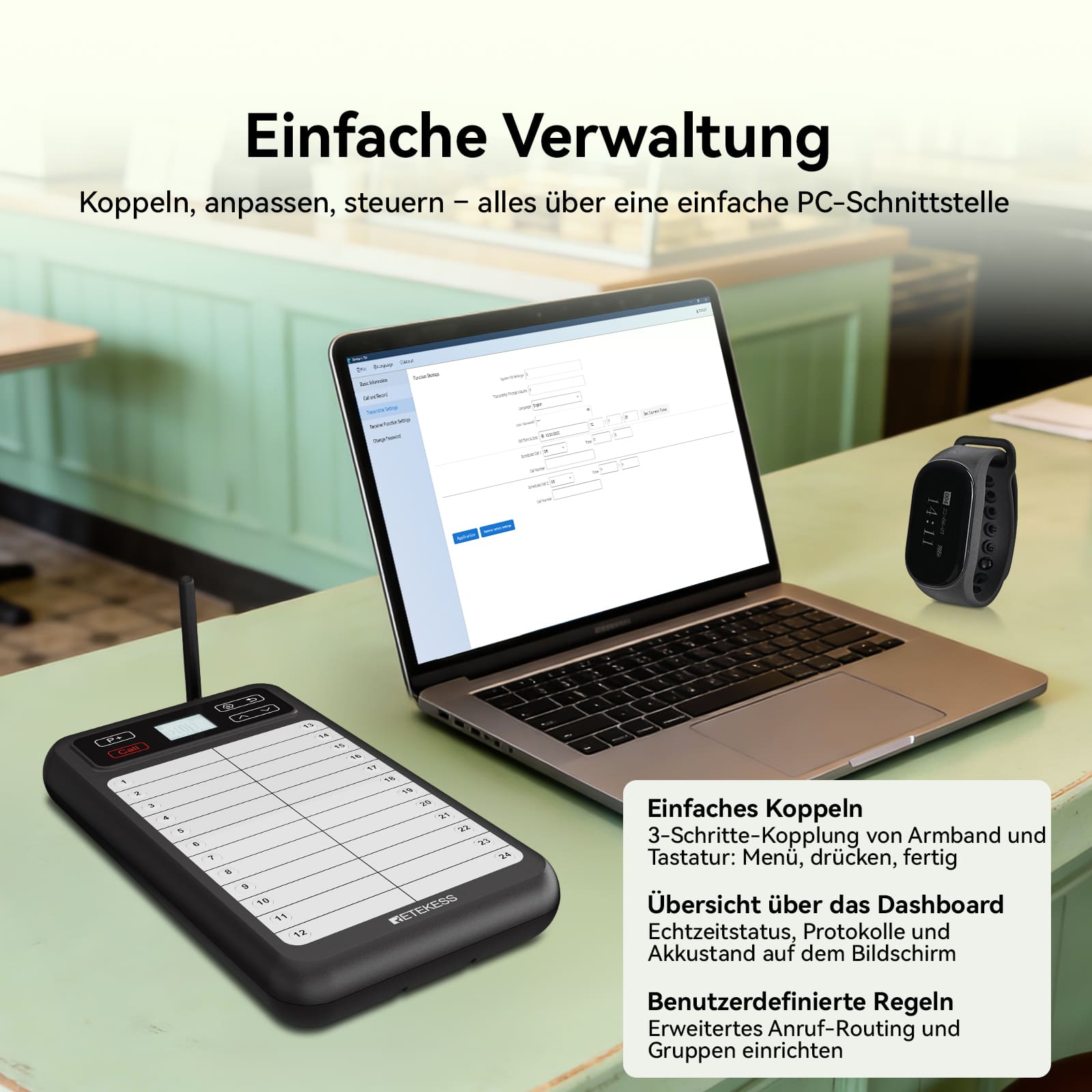 Das Pagersystem ist einfach zu verwalten; die Kopplung von Sender und Handgelenk ist unkompliziert. Benutzerdefinierte Einstellungen sind über den Computer verfügbar, sodass Administratoren Anrufregeln und Geräteinformationen schnell konfigurieren und die Bedienung vereinfachen können