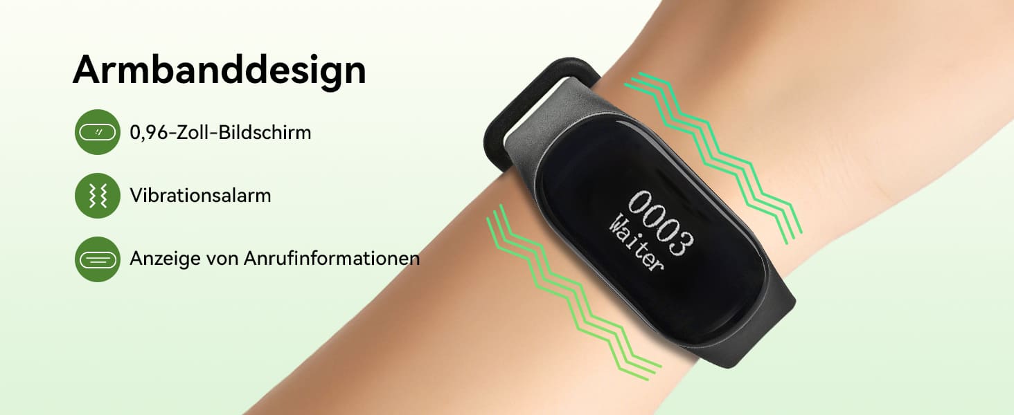 Der Handgelenkempfänger des Restaurant-Paging-Systems ist nach IPX7 wasserdicht und eignet sich daher ideal für den Einsatz in Strandbars oder anderen feuchten Umgebungen, ohne dass die Leistung beeinträchtigt wird
