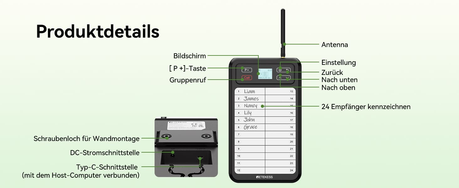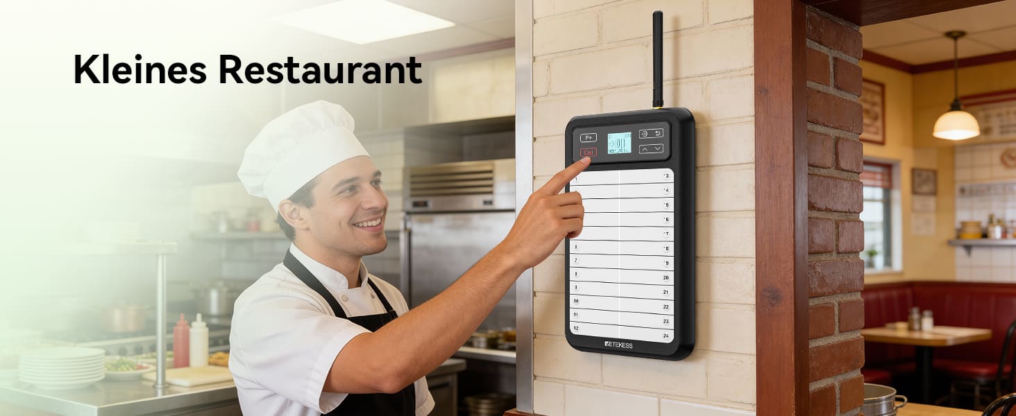 Das Pagersystem ermöglicht Einzel-, Gruppen- und Rundrufe für eine präzise und effiziente Kommunikation. Benutzer können die Anrufempfänger für bestimmte Mitarbeiter oder Teams individuell festlegen und so die Arbeitsabläufe im Restaurant optimieren