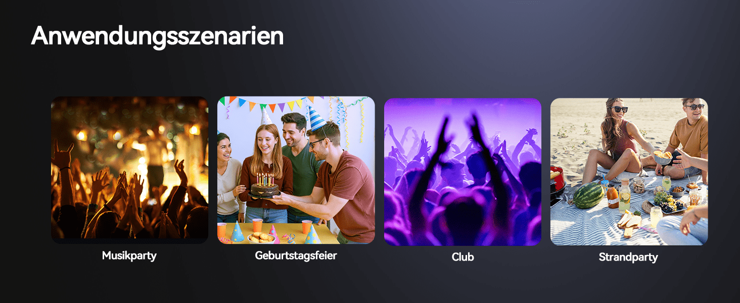 Besondere Merkmale: Campingpartys finden typischerweise im Freien in ruhiger Umgebung statt, oft in der Nähe malerischer Naturgebiete. Entspannung und Naturverbundenheit stehen bei Campingpartys im Vordergrund, doch herkömmliche Lautsprecher können die Ruhe der Umgebung stören.
