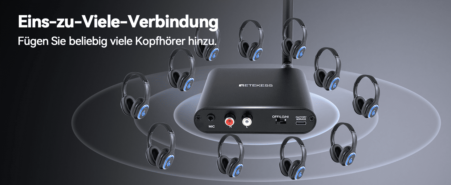 Genießen Sie echten Plug-and-Play-Betrieb mit sofortiger automatischer Kopplung. Der TA003 Sender bietet wählbare Hoch-/Niedrigleistungs-Modi und liefert eine stabile Signalreichweite von bis zu 300 m im Freien – so können Gäste den gesamten Veranstaltungsort durchstreifen, ohne einen Beat zu verpassen. Zudem unterstützt ein einziger Sender unbegrenzt viele Kopfhörer, sodass Sie Ihre Party mühelos erweitern können.