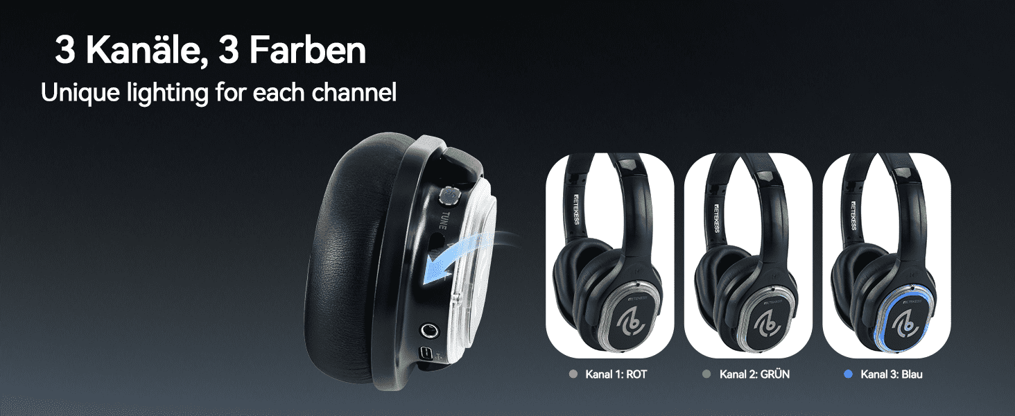 Jeder TA004 Silent Disco Party-Kopfhörer verfügt über drei unabhängige Audio-Kanäle, klar angezeigt durch rote, blaue oder grüne LED-Lichter. Sehen Sie leicht, wer zu welcher Playlist vibriert – keine Verwirrung, nur Spaß. Währenddessen pulsieren die mehrfarbigen Lichter synchron zum Beat, entzünden sofort die visuelle Atmosphäre und schaffen ein Partyerlebnis, das sowohl stilvoll als auch immersiv ist.