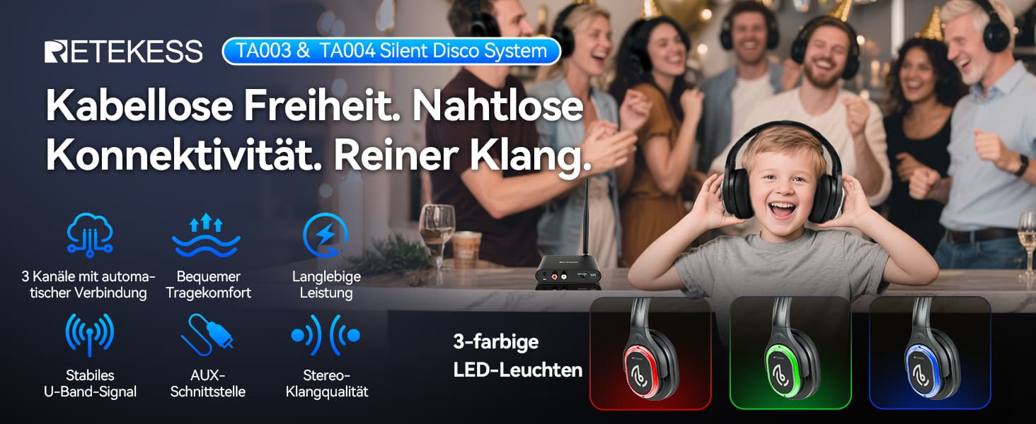 Zeit für eine Party ohne Sperrstunde! Das Retekess TA003 TA004 Silent Disco System ist Ihre ultimative Lösung für Lärmverordnungen. Selbst die anspruchsvollsten Nachbarn bleiben zufrieden – denn es hält den Lärm im Inneren. Keine unnötigen Polizeibesuche mehr, also kann die Party die ganze Nacht gehen! Drücken Sie einfach auf Play und veranstalten Sie Ihre Silent Disco überall und jederzeit. Ihre Party, Ihre Musik, unter Ihrer Kontrolle. Perfekt für Hochzeiten, Festivals, Hauspartys, Schulveranstaltungen und Firmenevents – halten Sie die Stimmung die ganze Nacht lang aufrecht.