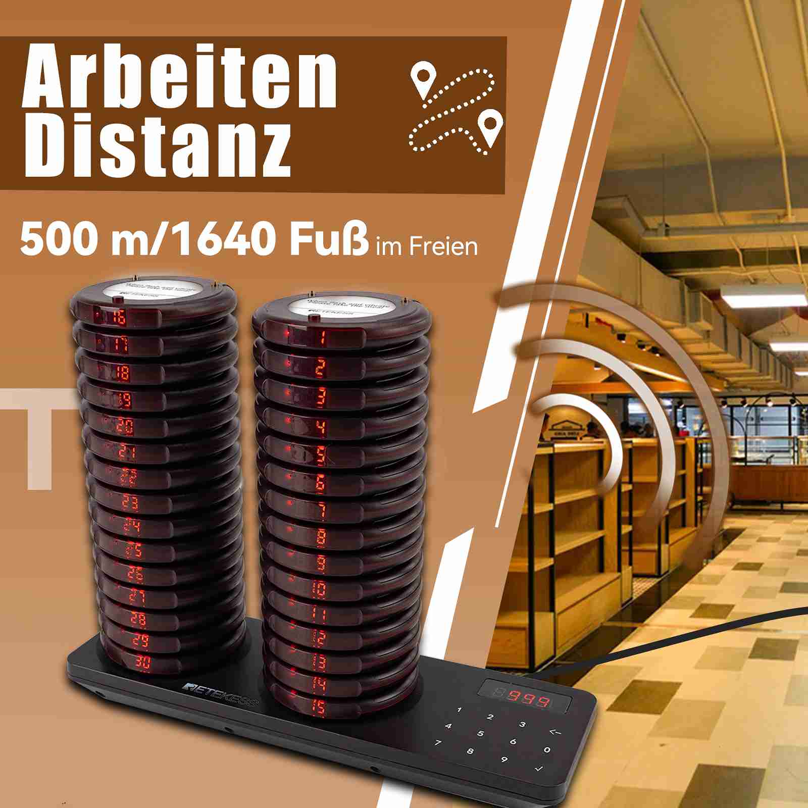 Große Reichweite; Die Reichweite des Restaurant-Pagersystems beträgt 400–500 Meter im Freien und 100–300 Meter in Innenräumen.