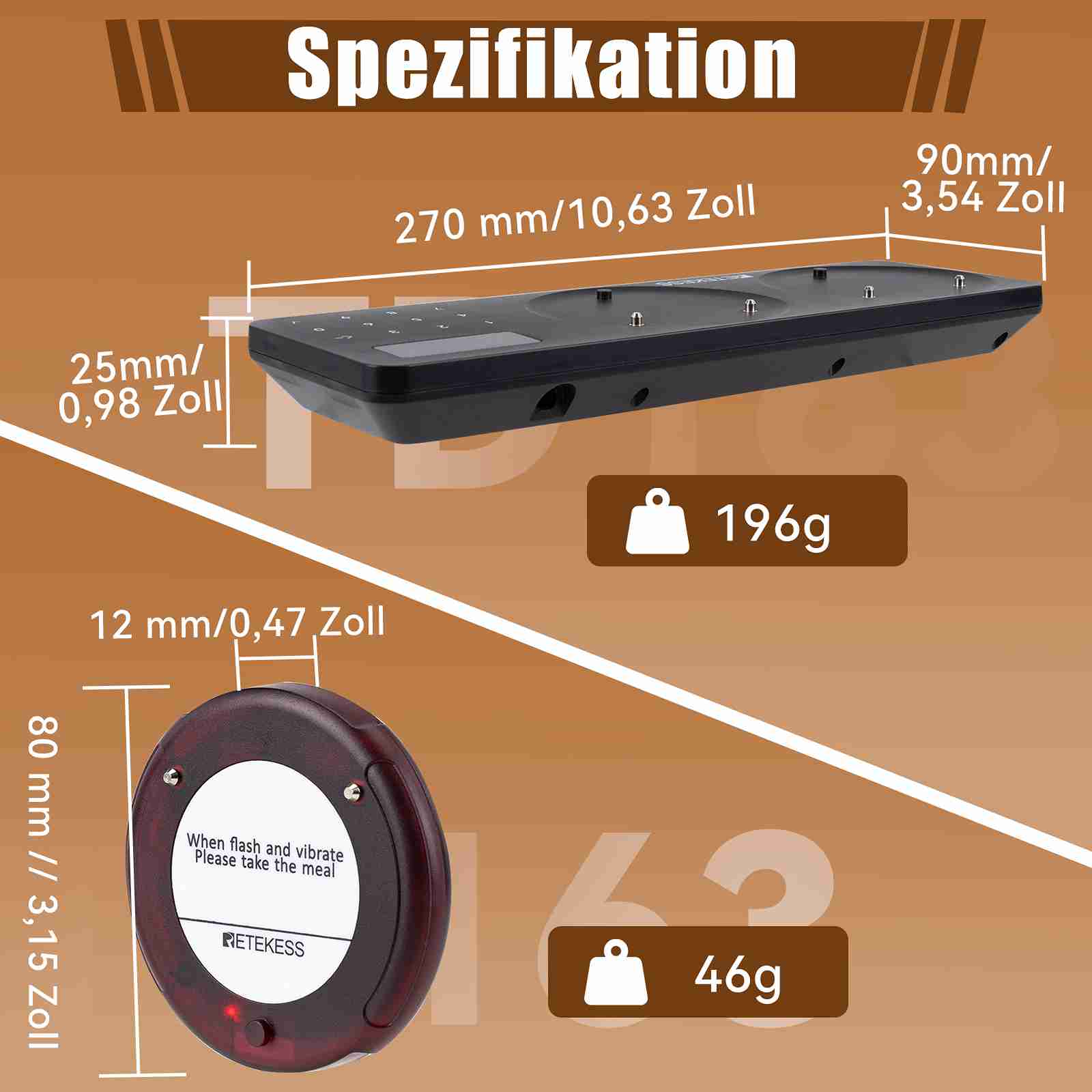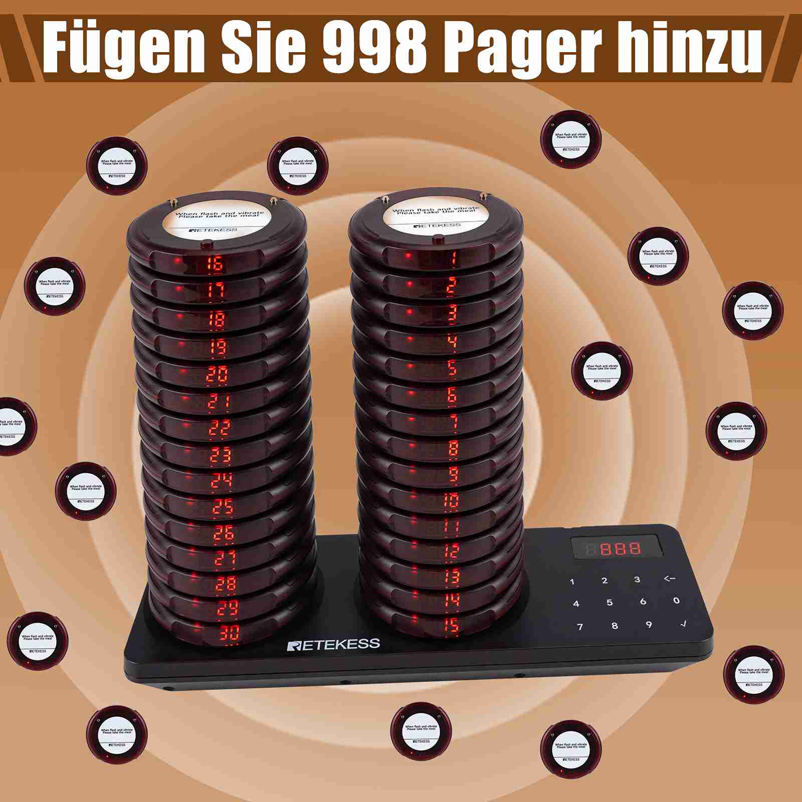 Das drahtlose Pagersystem Retekess TD163 ist das neue Modell für Unternehmen mit hohem Pagerbedarf. Jeder Tastenfeldsender kann bis zu 20 Gastpager gleichzeitig aufladen. Es lassen sich Erweiterungspager hinzufügen, sodass insgesamt 998 Einheiten möglich sind. Im Vergleich zu anderen Pagersystemen ist dieses Modell platzsparender und benutzerfreundlicher.