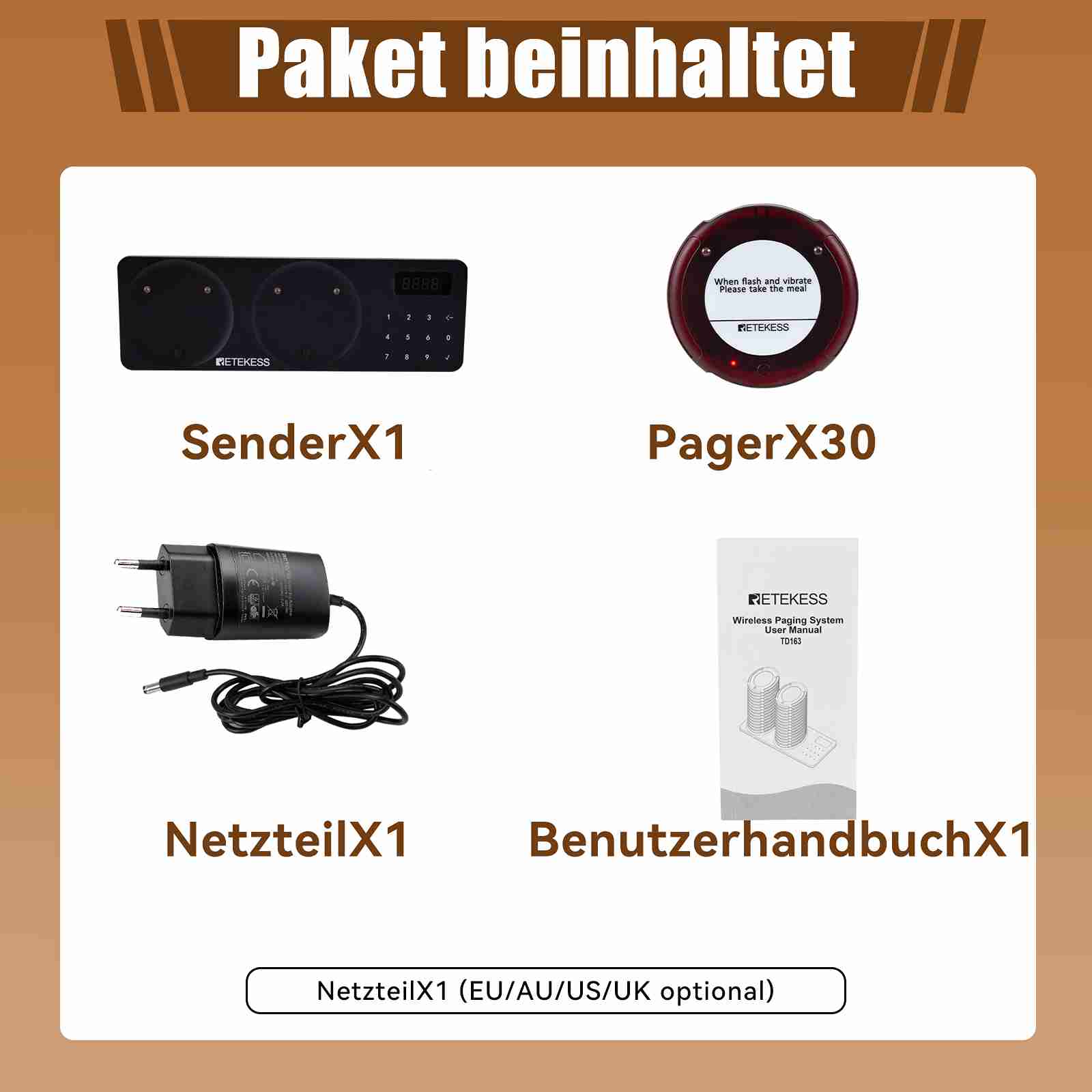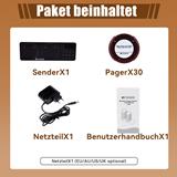 | 1 Tastatur und 30 Pager | Tastatursender x 1 Untersetzer x 30 Netzteil x 1 Benutzerhandbuch x 20 |