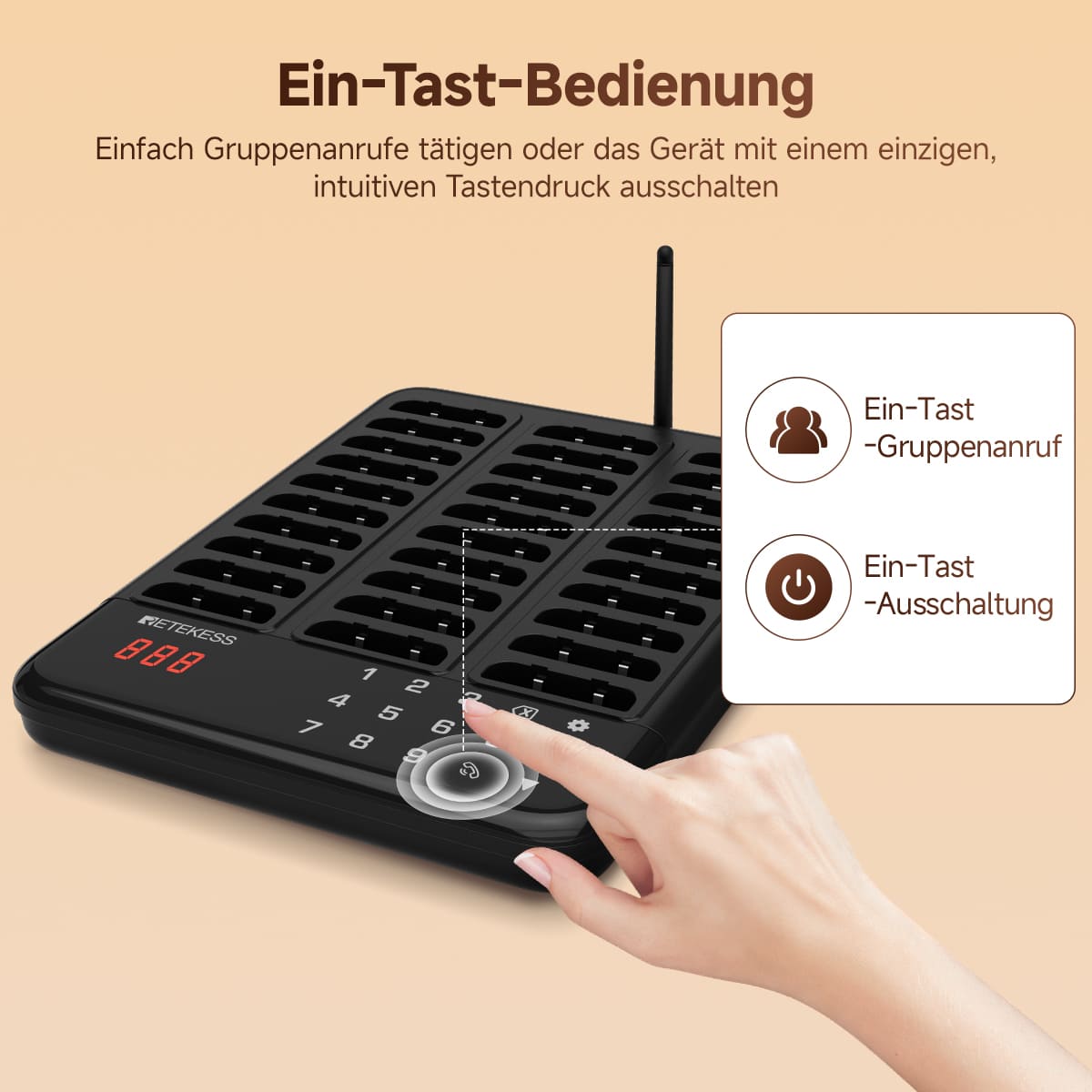 Das Pagersystem unterstützt das Ausschalten per Knopfdruck, die drahtlose Code-Anpassung sowie Lade- und Vollladebenachrichtigungen. Es ist einfach zu bedienen.