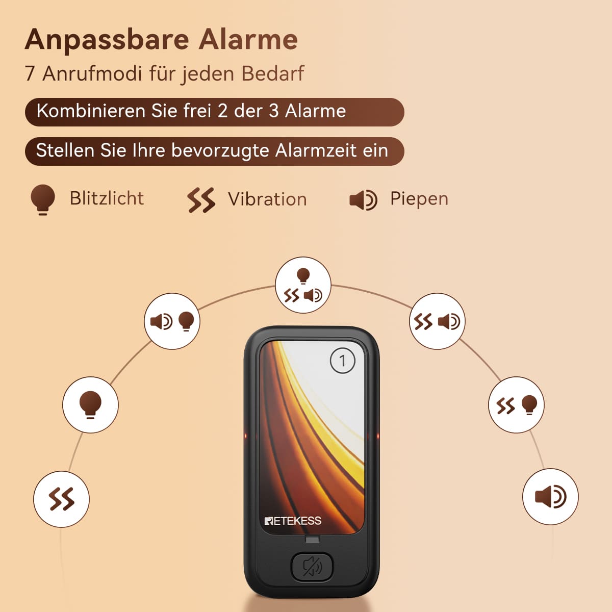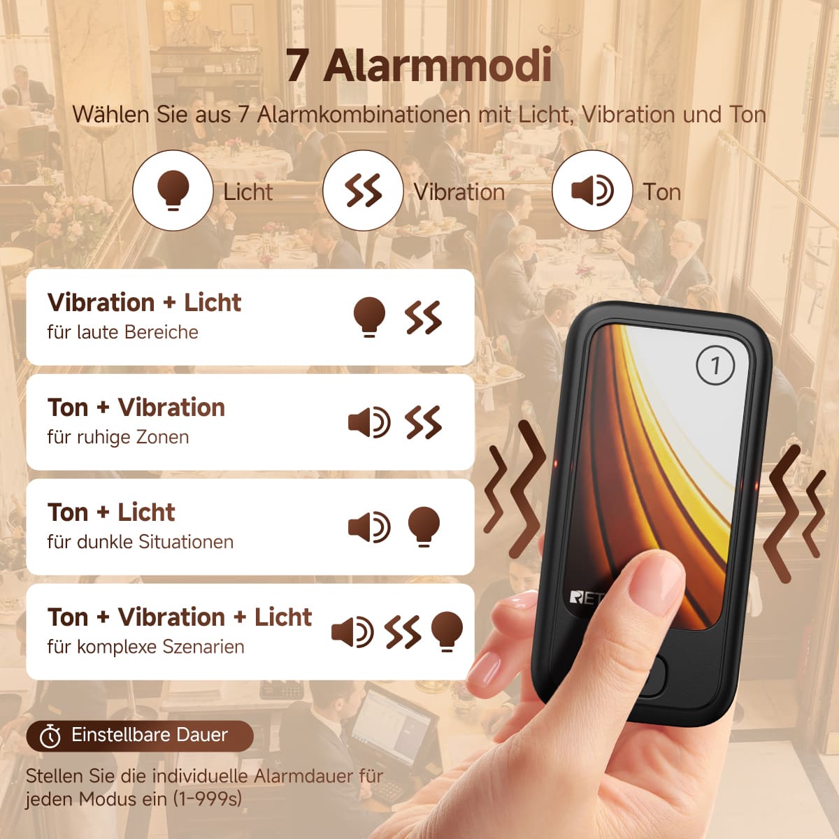 Pager mit 7 Modi: Signalton, Vibration und LED-Blinken (beliebige Kombinationen möglich)