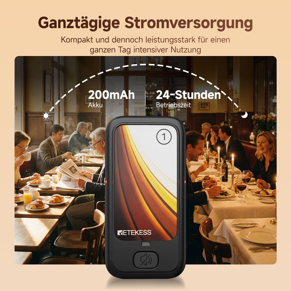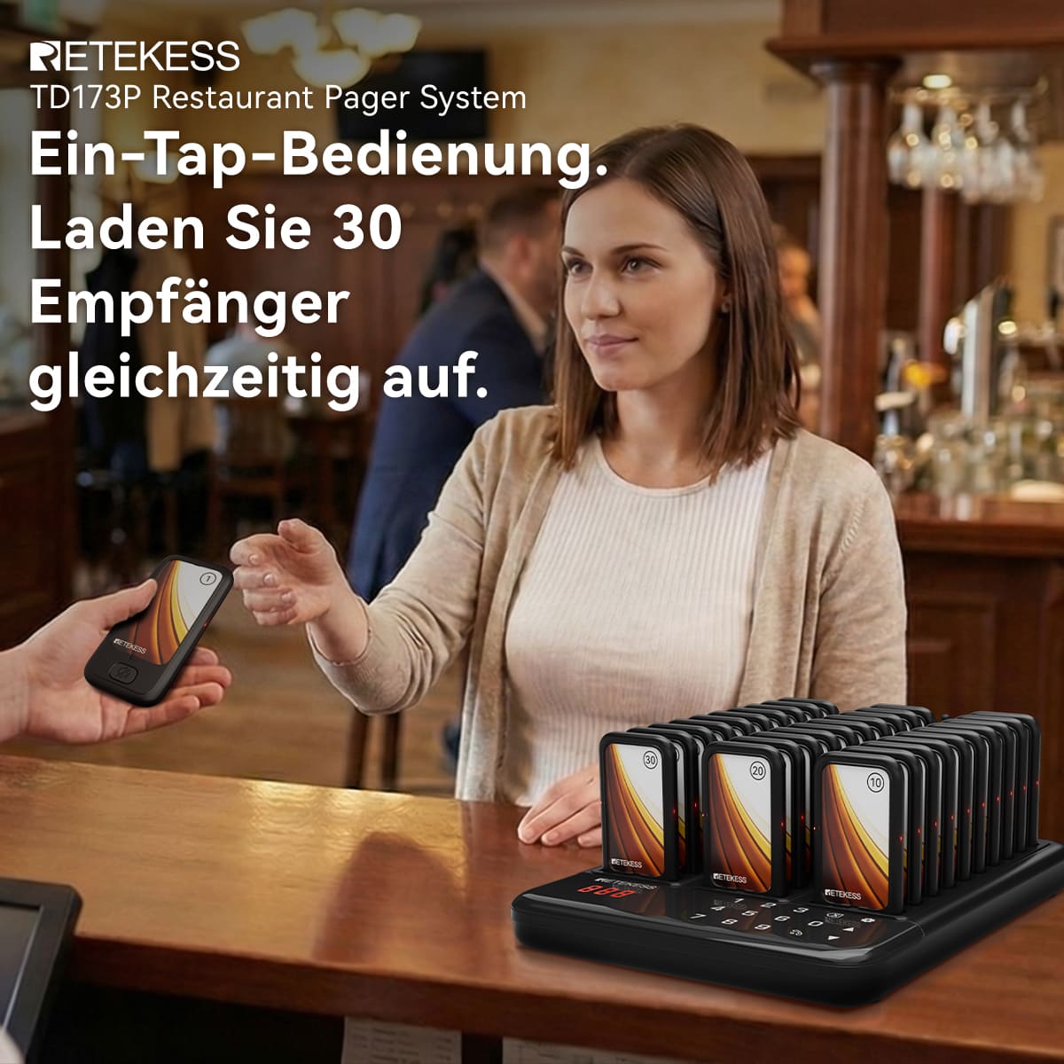 Die drahtlosen Kundenrufsysteme TD173 und TD173P sind die ideale Lösung für kleine Restaurants und Imbisswagen. Das System TD173 umfasst einen Sender und 20 wiederaufladbare Pager, das System TD173P einen Sender und 30 wiederaufladbare Pager. Hergestellt aus umweltfreundlichem PC+ABS-Material, sind sie robust und langlebig. Das Touchpad aus Acryl bietet eine angenehme Haptik und reaktionsschnelle Tasten. Mit diesem System können Restaurantbetreiber ihre Gäste einfach benachrichtigen, sobald ein Tisch frei ist, was die Effizienz steigert und die Kundenzufriedenheit erhöht.