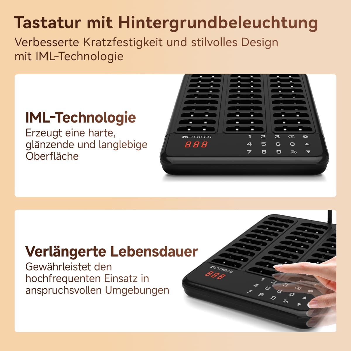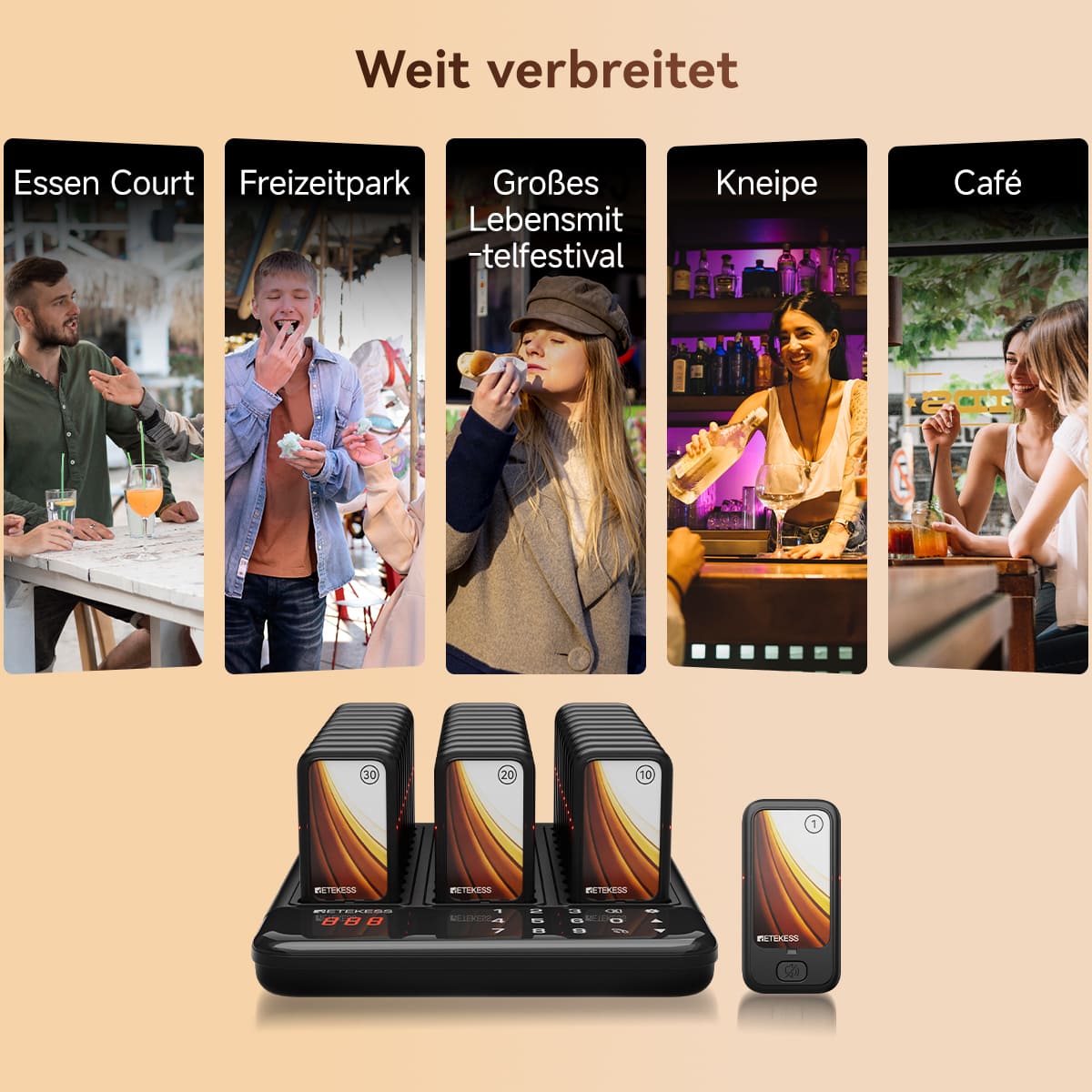 Ein Kombinationsset mit 20 oder 30 Pagern ist erhältlich und bietet Robustheit, Langlebigkeit und einen stabilen Betrieb – ein großer Vorteil dieses Produkts. Es eignet sich für verschiedene Bereiche mit Warteschlangenmanagement, darunter Gastronomie, Gesundheitswesen, Unterhaltung und Dienstleistungsbranche.