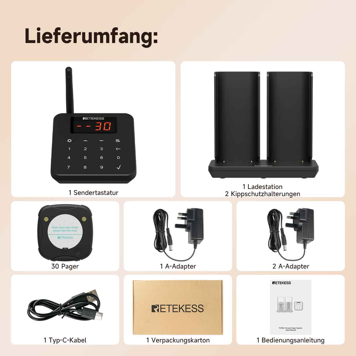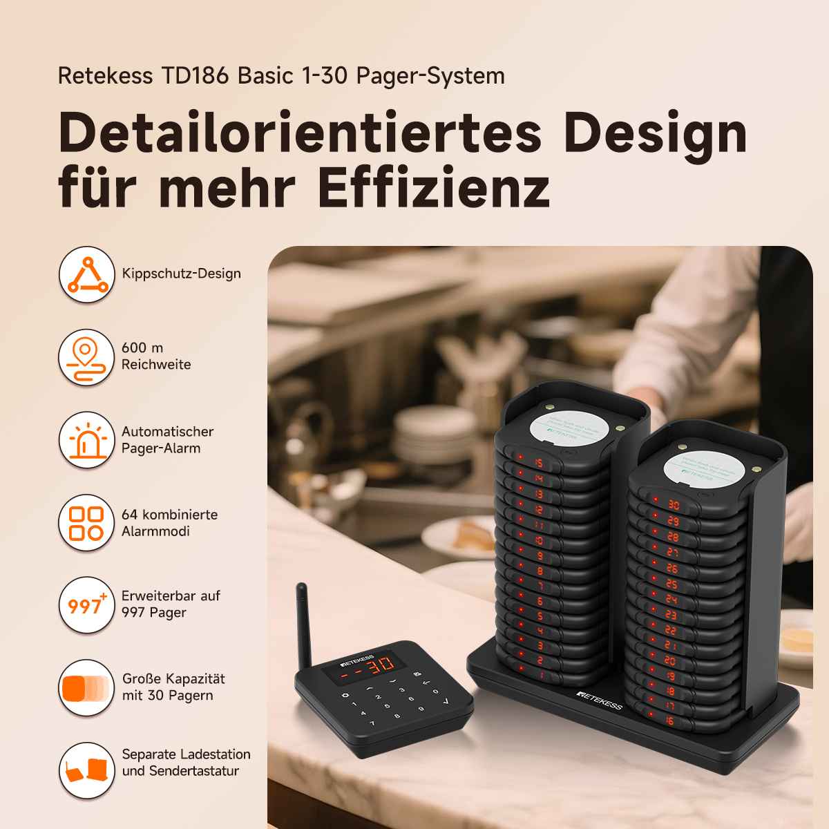 Der Retekess TD186 ist kippsicher und ermöglicht die Trennung von Ladestation und Sendertastatur. Dank verschiedener Pager-Kombinationen und der Stummschaltung per Knopfdruck schaffen Sie ein komfortables und bequemes Restauranterlebnis für Ihre Gäste und optimieren gleichzeitig die Serviceeffizienz.