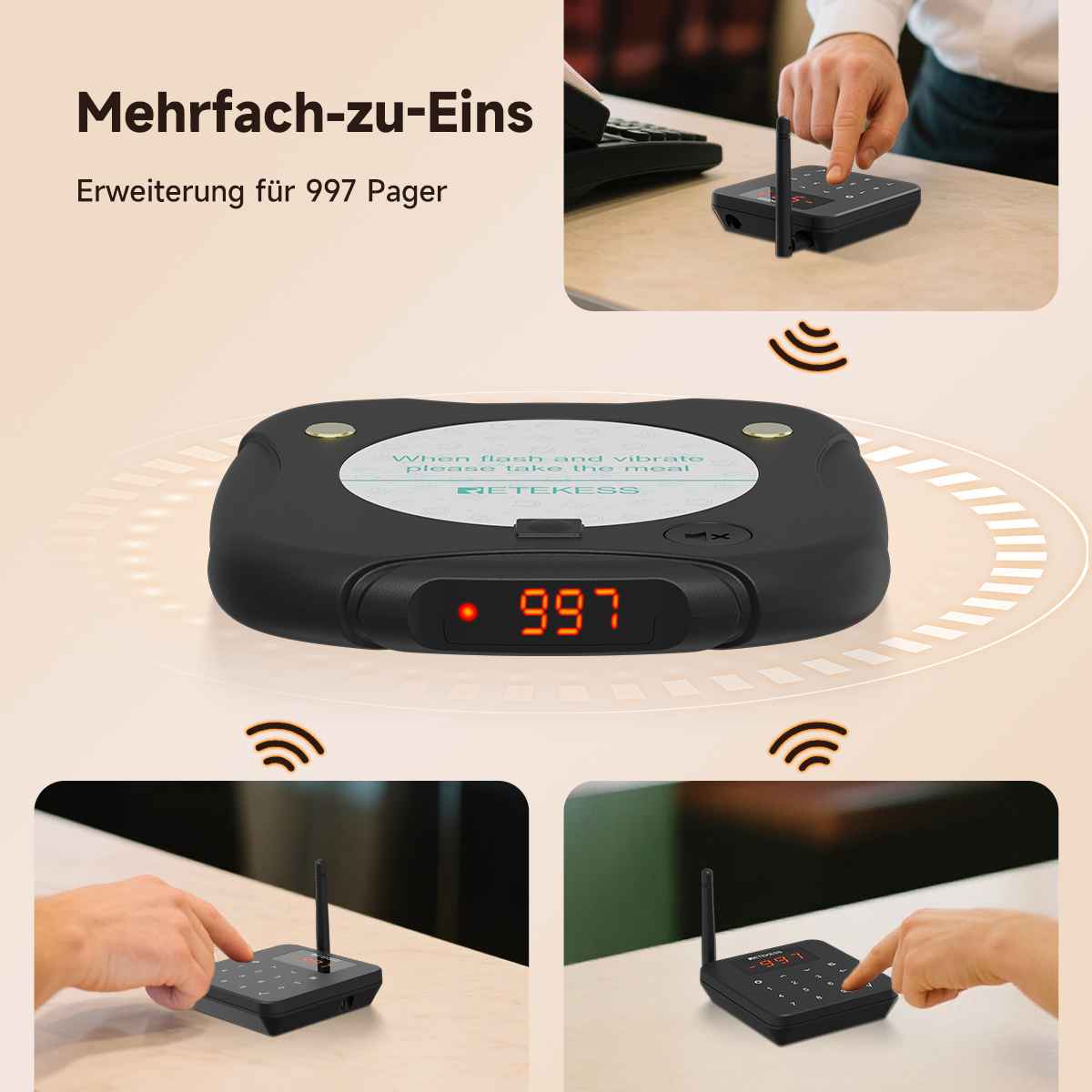 Erweiterbar auf über 997 Pager. Unterstützt die Viele-zu-eins-Kommunikation, sodass mehrere Tastaturen denselben Pager anrufen können.