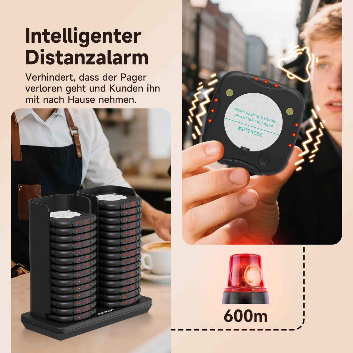 Sollte ein Kunde den Pager versehentlich mehr als 600 Meter von sich entfernen, ertönt ein Signalton. Diese effektive Erinnerungsfunktion verhindert, dass der Restaurant-Pager entwendet wird.