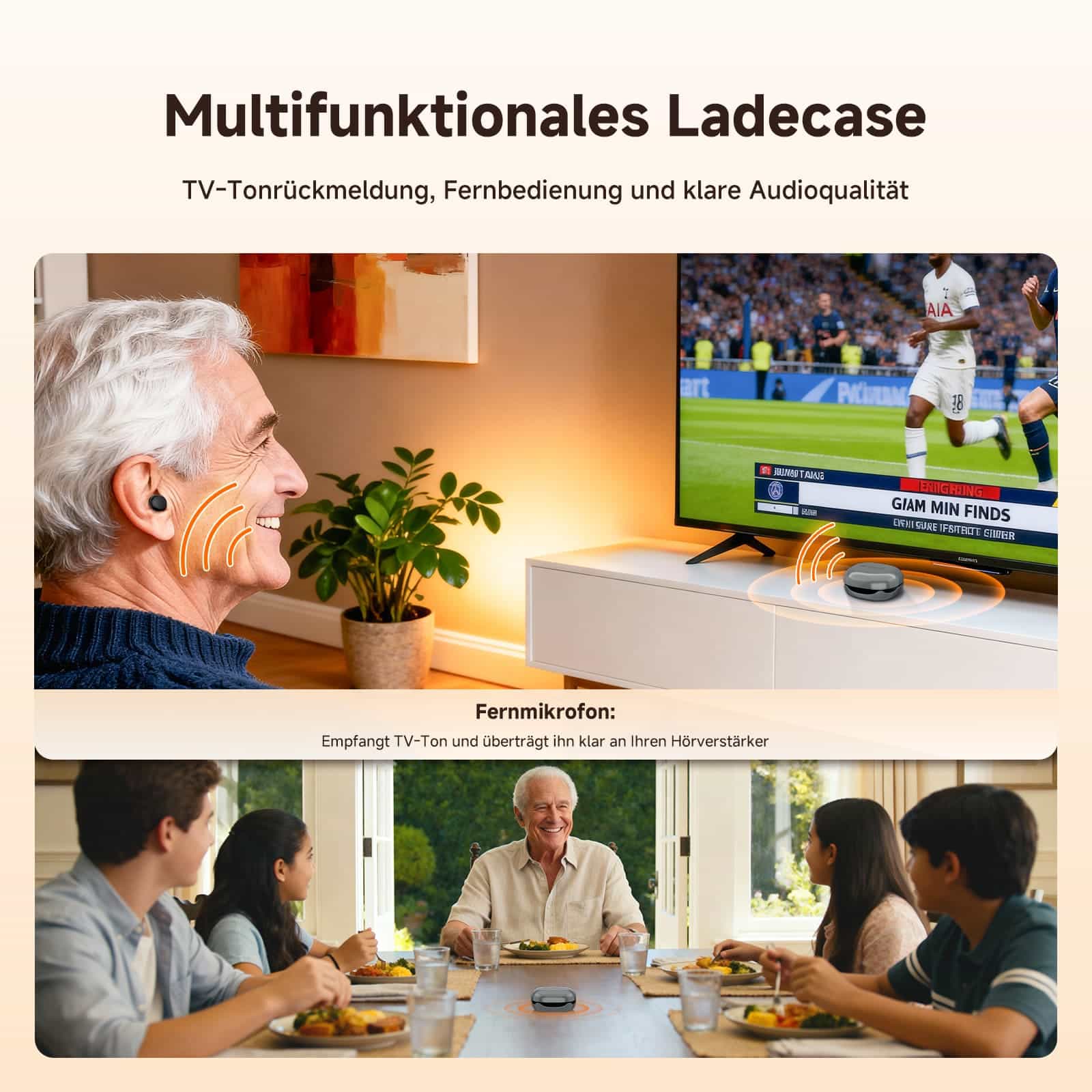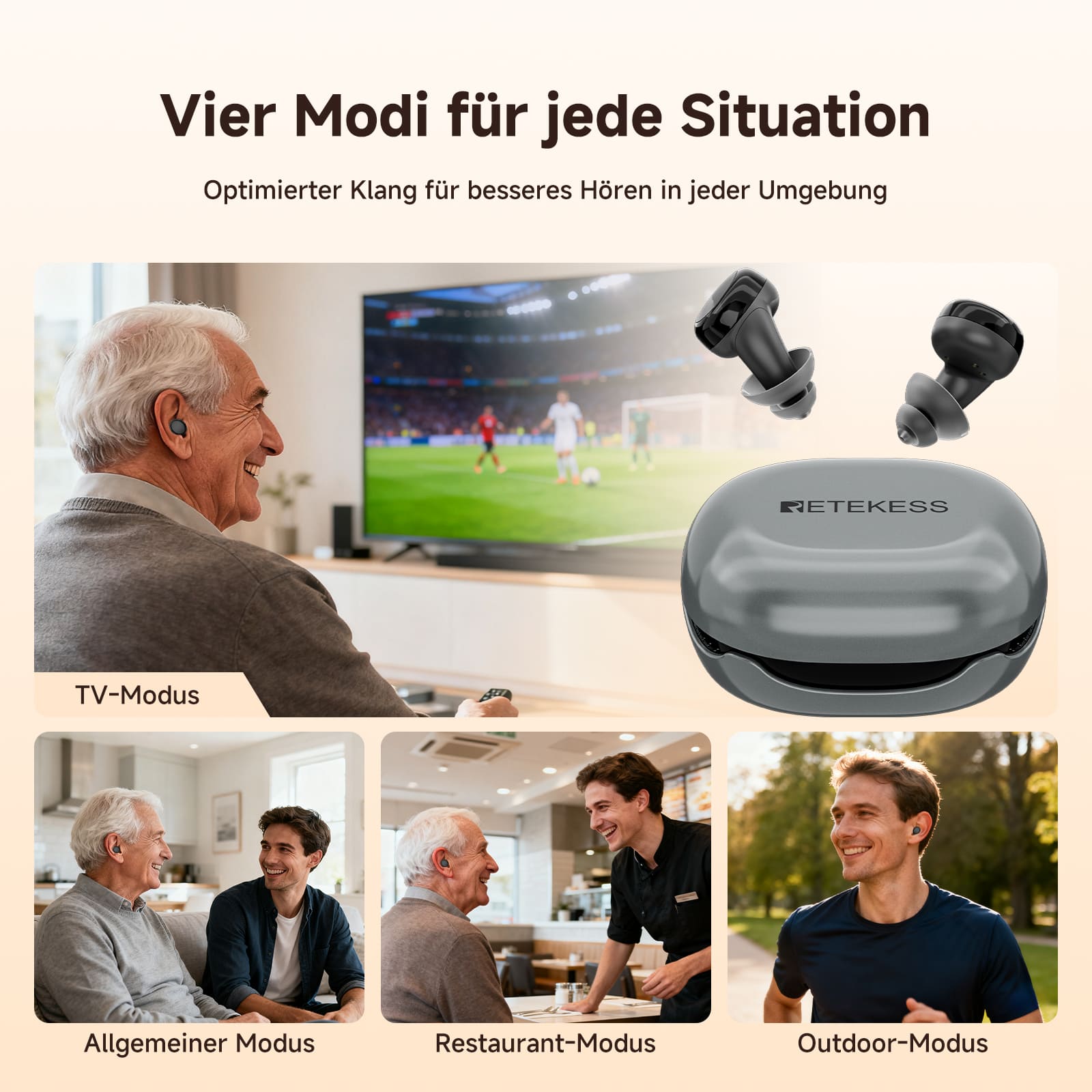 Das wiederaufladbare Hörgerät bietet vier Modi: Allgemein, Restaurant, TV und Outdoor. Der allgemeine Modus eignet sich für den Alltag, der Restaurantmodus ist ideal für konzentrierte Gespräche, der TV-Modus sorgt für klaren Klang und der Outdoor-Modus reduziert Windgeräusche. Die automatische Speicherfunktion speichert die Einstellungen vom letzten Ausschalten beim Einschalten des Geräts und vereinfacht so die Bedienung.