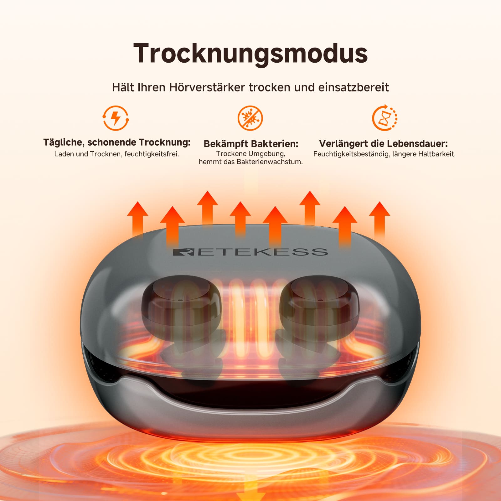 Das multifunktionale Ladecase dient nicht nur zum Laden und zur gezielten Schallaufnahme, sondern verfügt auch über eine Trocknungsfunktion für das Hörgerät. Dies verlängert dessen Lebensdauer und sorgt für ein angenehmes Tragegefühl.