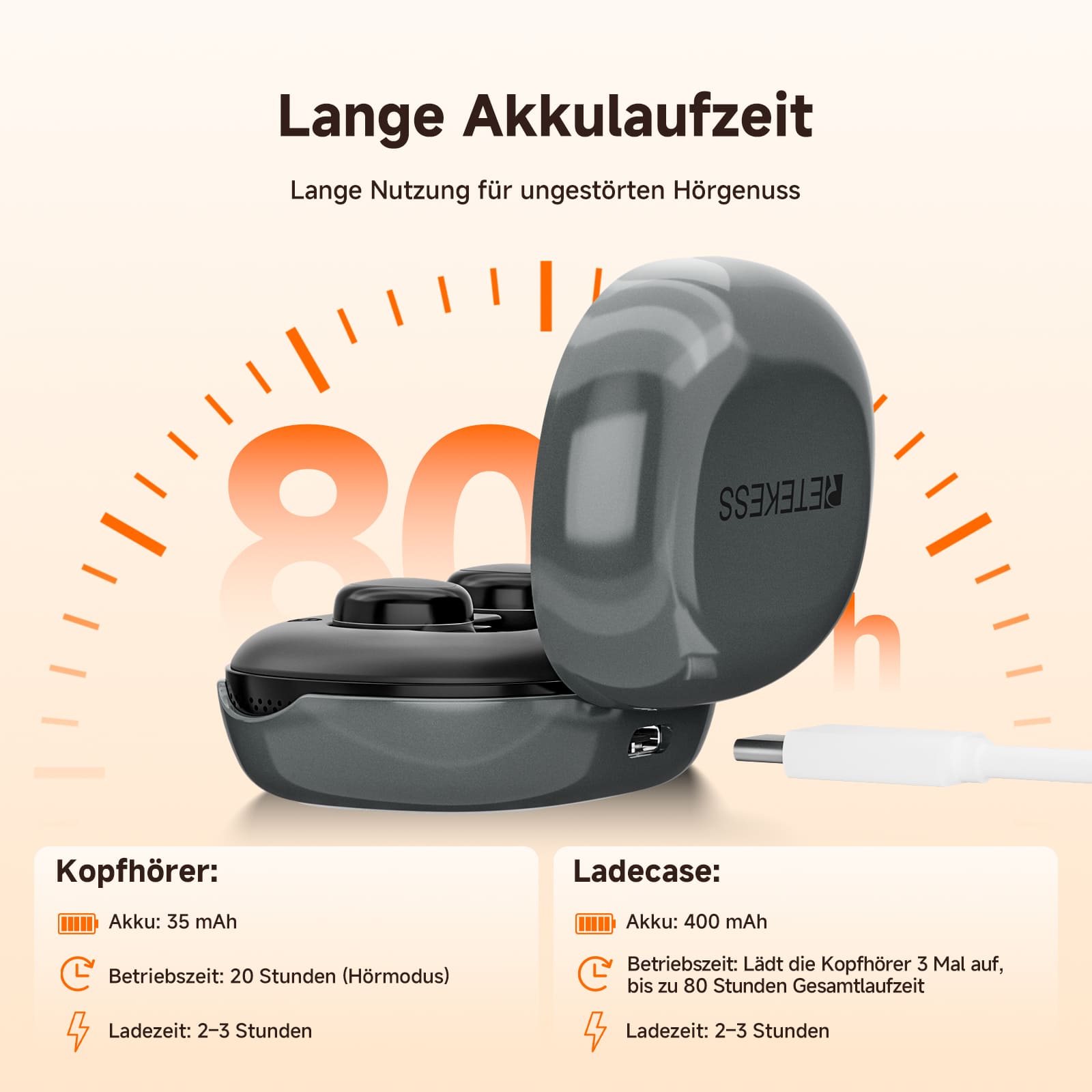 Dieses diskrete Hörgerät bietet bis zu 20 Stunden Nutzungsdauer mit einer einzigen Ladung. Das Ladecase ermöglicht drei Ladungen, die jeweils 2–3 Stunden dauern, was eine Gesamtnutzungszeit von 80 Stunden ergibt. Es verfügt über eine automatische Warnung bei niedrigem Akkustand und eine intelligente App-Überwachung für doppelten Schutz.