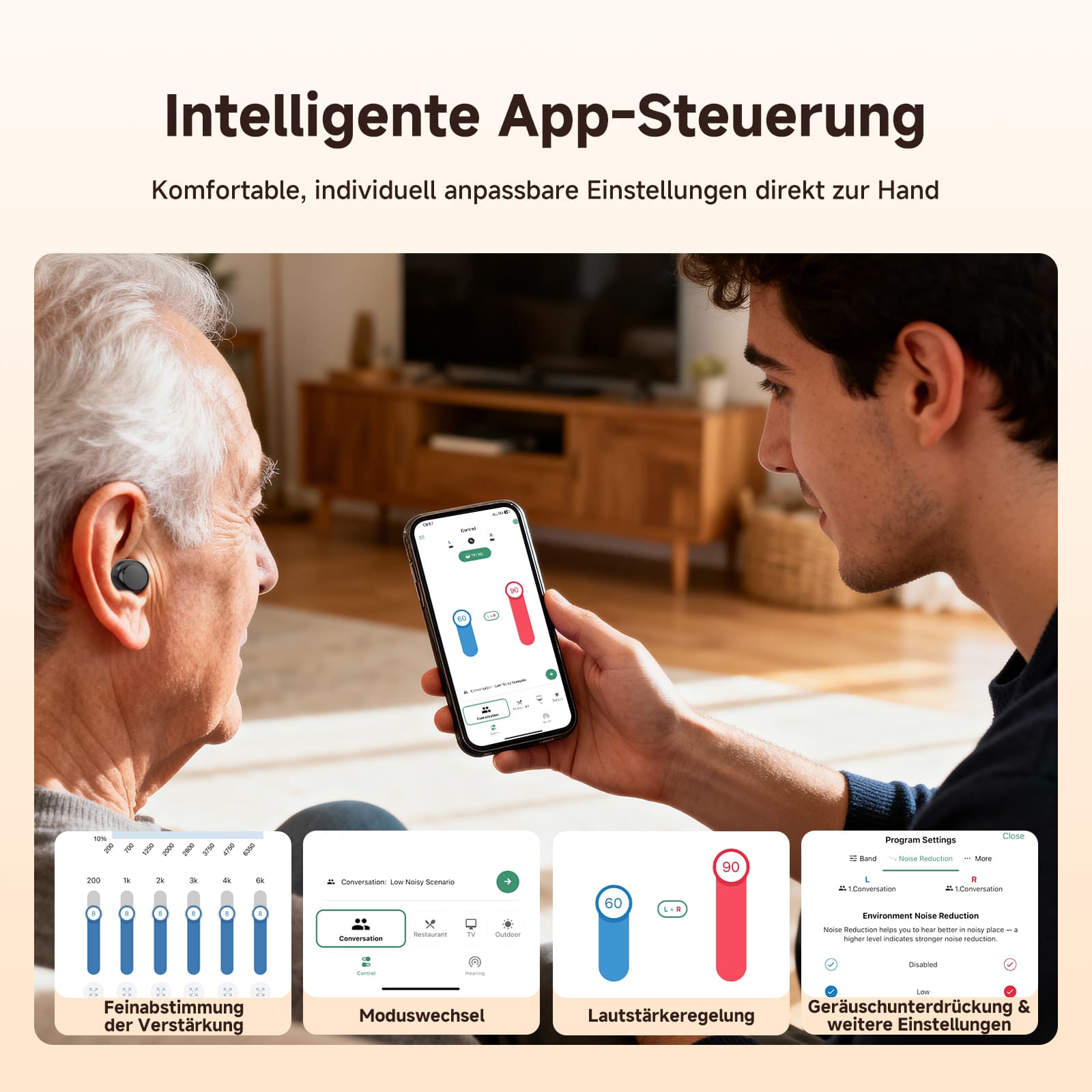 Mit der zugehörigen App können Sie die Lautstärke anpassen, zwischen verschiedenen Modi wechseln, den Akkustand überwachen, Verstärkung und Frequenzgang individuell einstellen sowie weitere Einstellungen für Bandbreite und Rauschunterdrückung vornehmen.