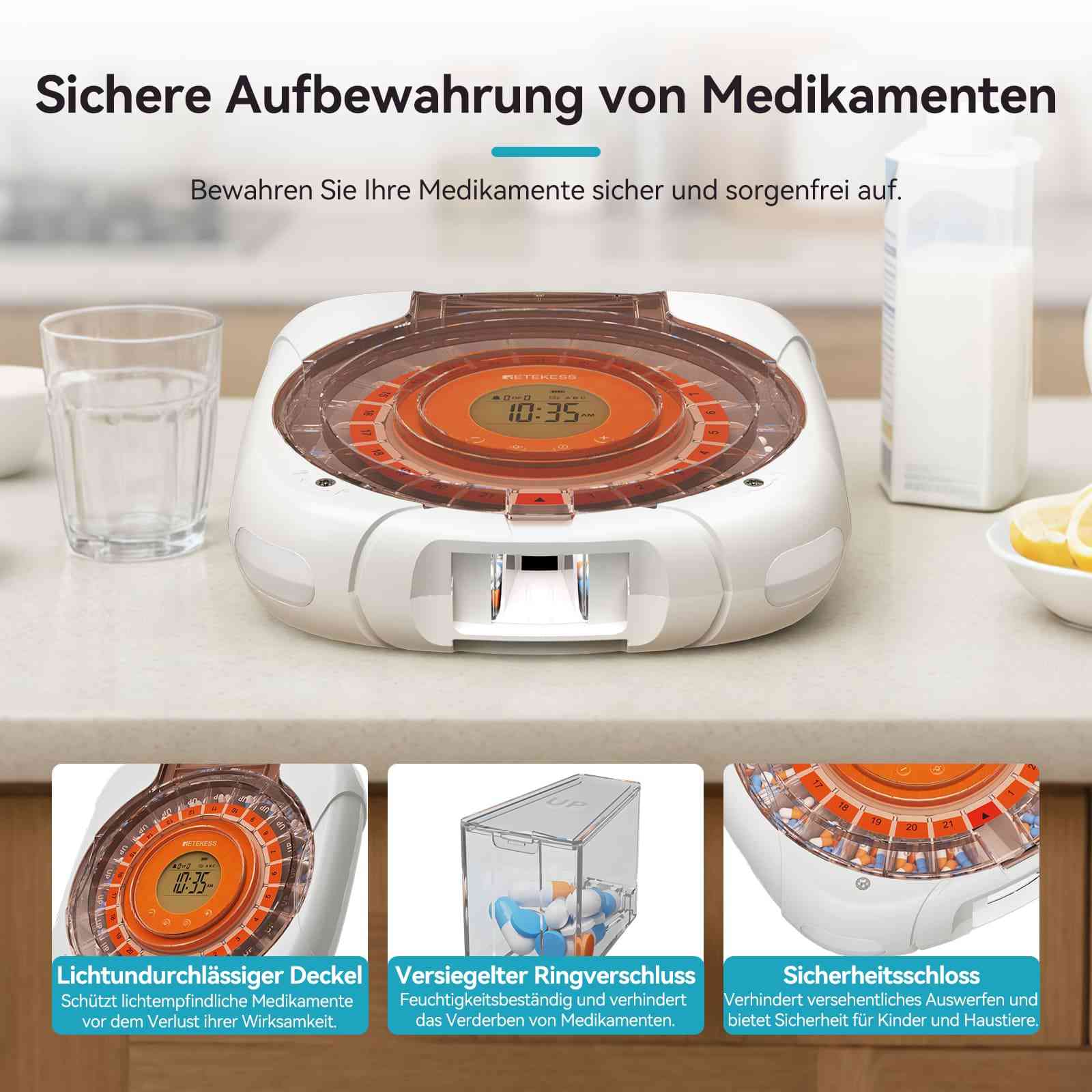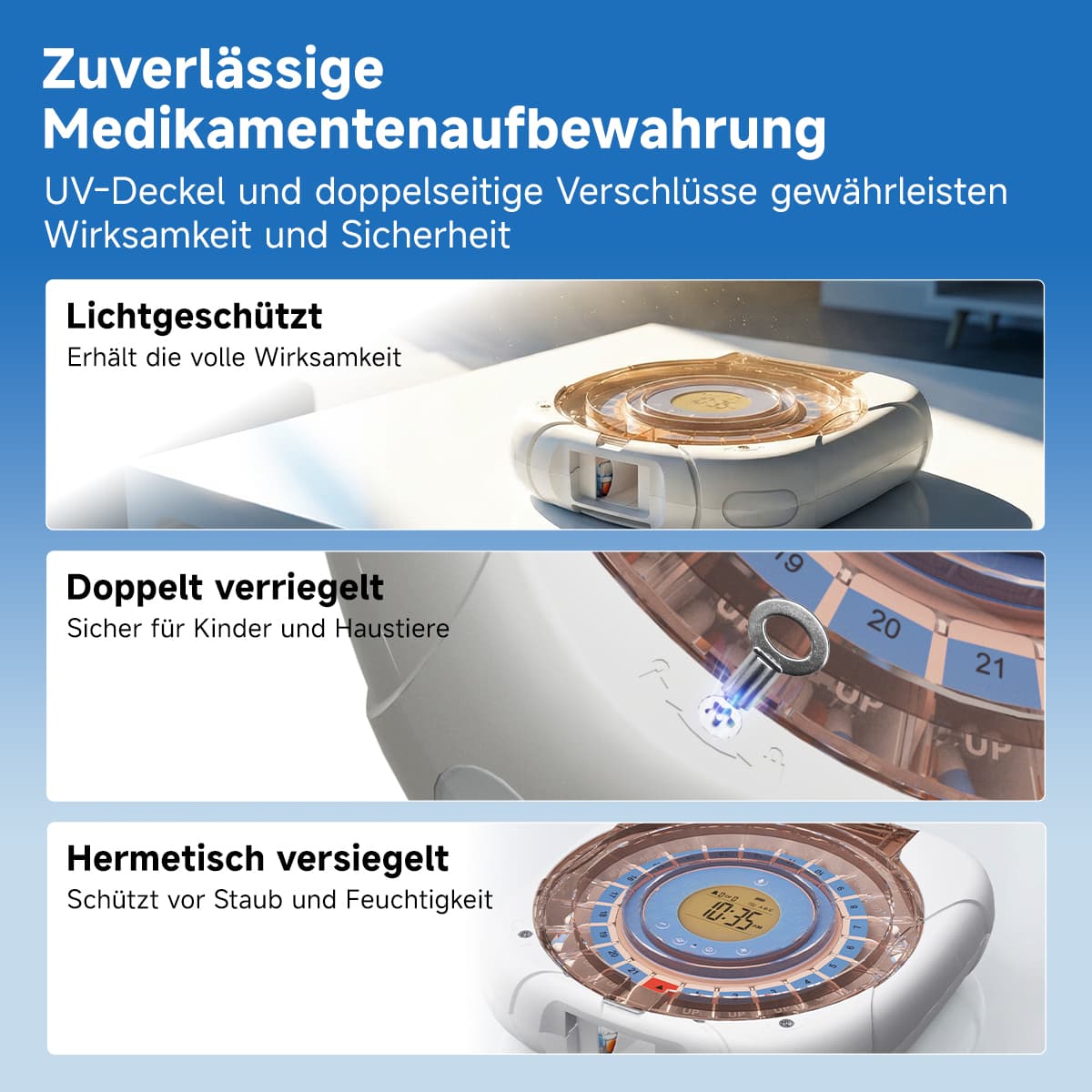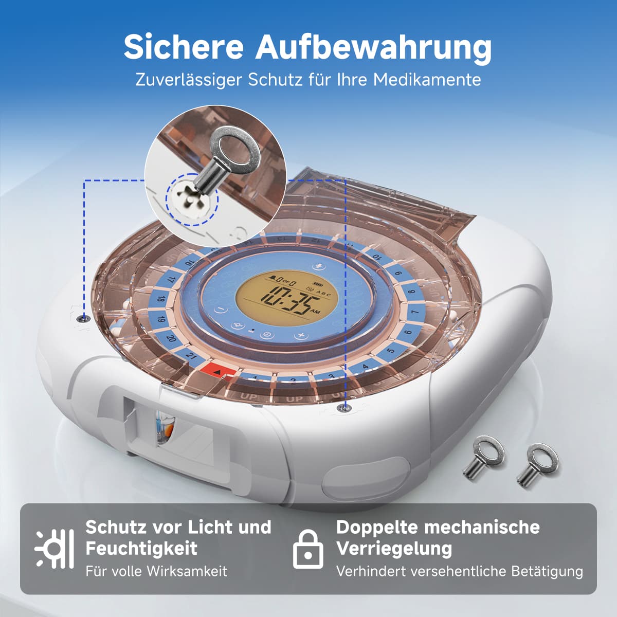 21 einzelne, herausnehmbare Fächer ermöglichen eine individuelle Anpassung oder Reinigung und machen Wartung und Erweiterung besonders einfach. Ein Sicherheitsschloss verhindert den Zugriff von Kindern oder Unbefugten auf die Medikamente und bietet so zusätzliche Sicherheit für Ihre Familie.
