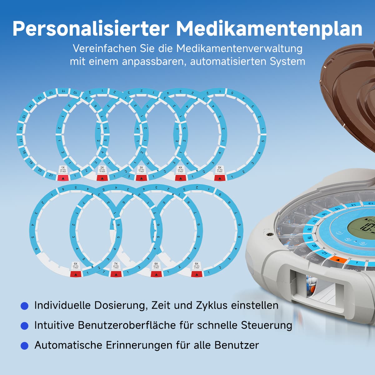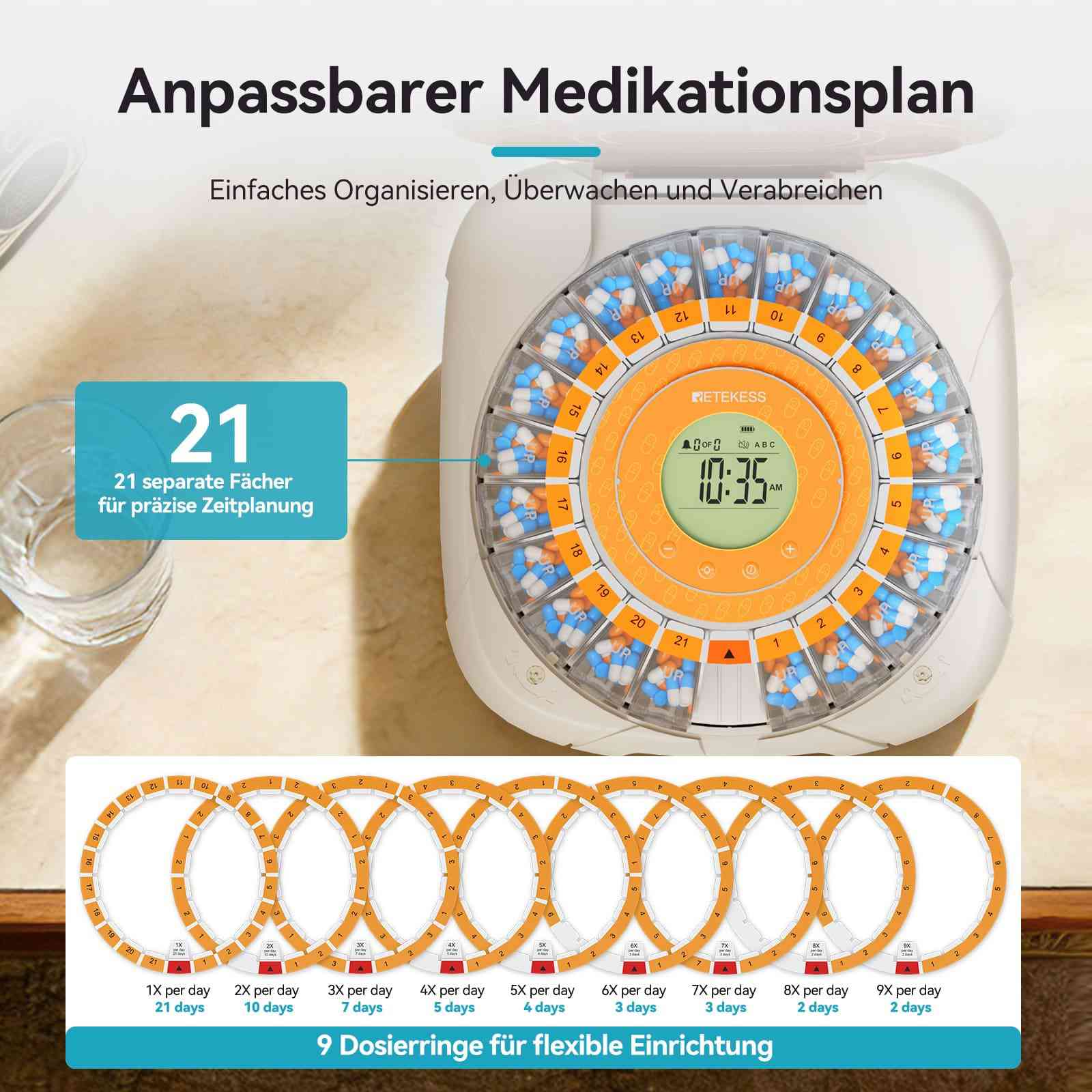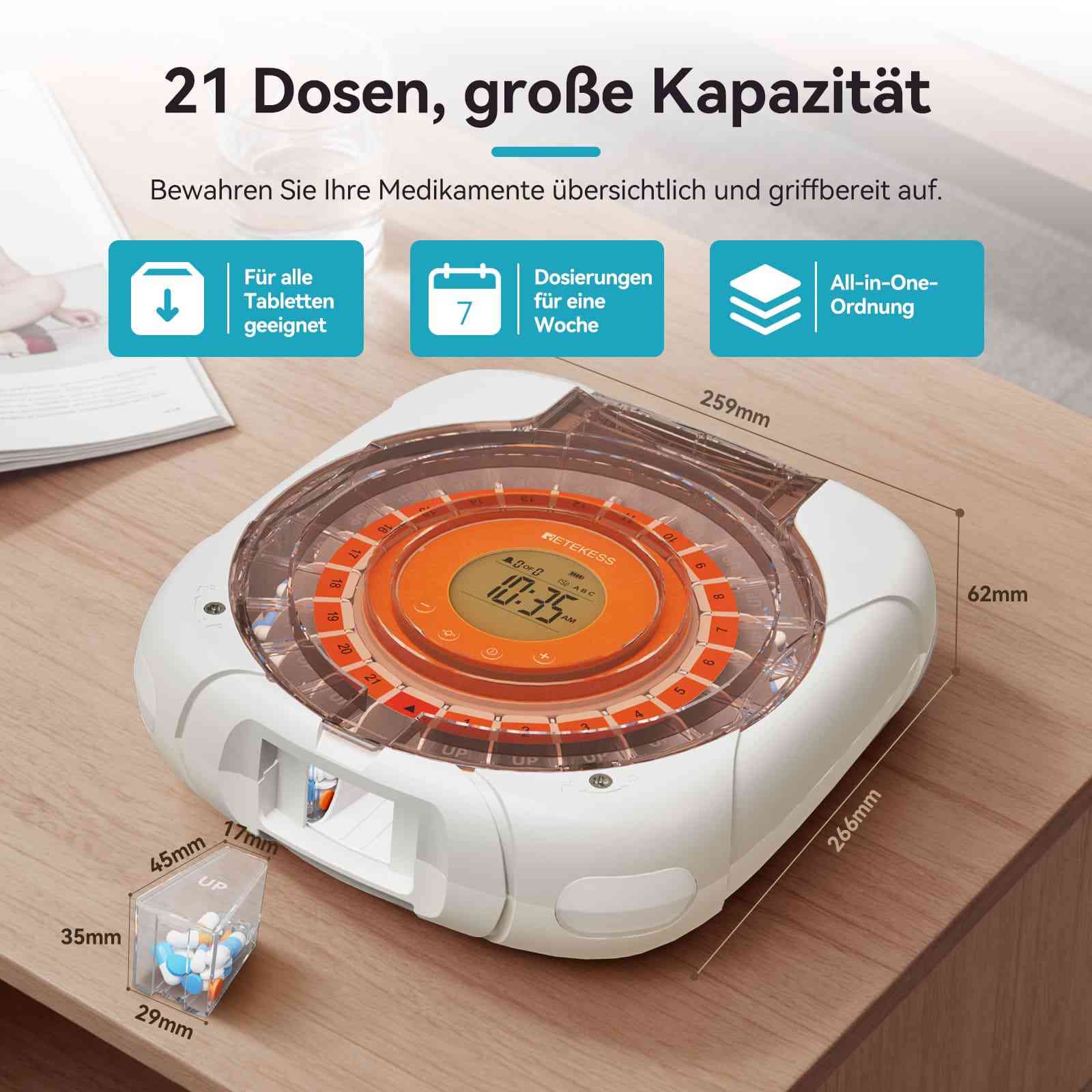 21 einzelne, herausnehmbare Fächer ermöglichen eine individuelle Anpassung oder Reinigung und machen Wartung und Erweiterung besonders einfach. Ein Sicherheitsschloss verhindert den Zugriff von Kindern oder Unbefugten auf die Medikamente und bietet so zusätzliche Sicherheit für Ihre Familie.
