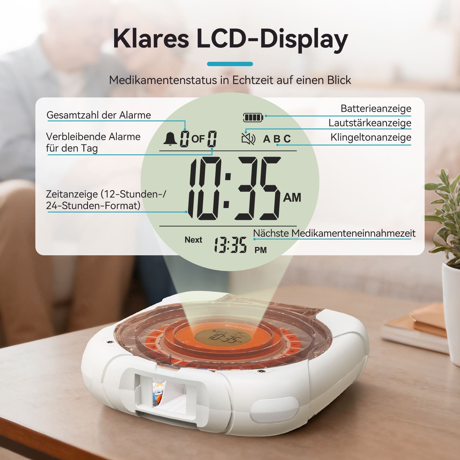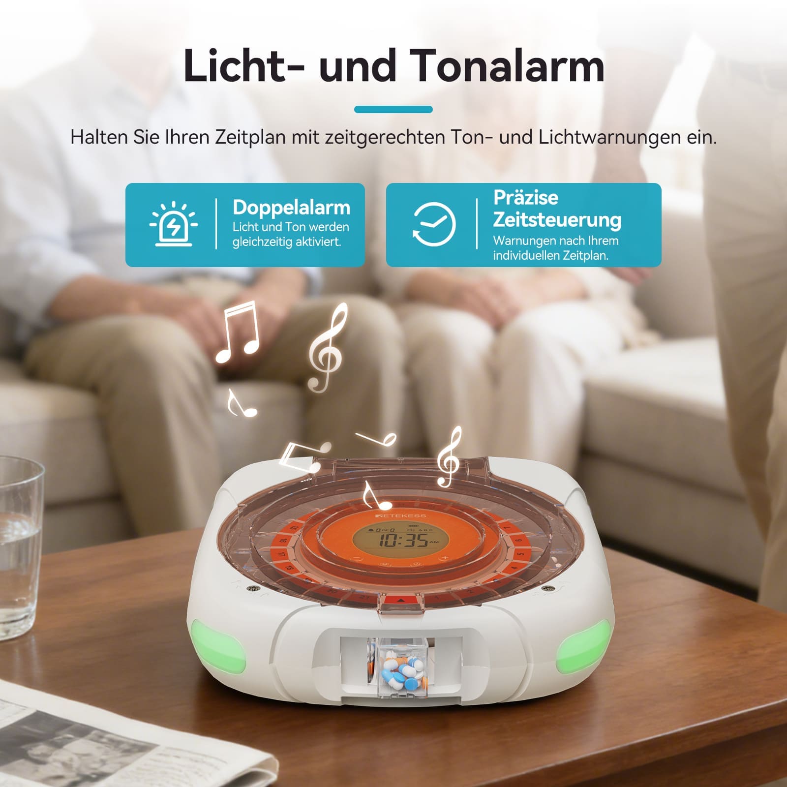 Bis zu 9 individuell anpassbare Erinnerungsgruppen pro Tag sind ideal für komplexe Mehrfachdosierungsschemata. Bei Alarm ertönt ein helles Blinklicht und ein lauter Piepton, sodass Sie auch in lauter Umgebung keine Dosis verpassen.
