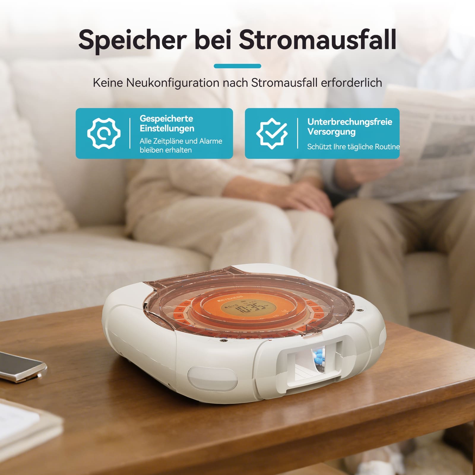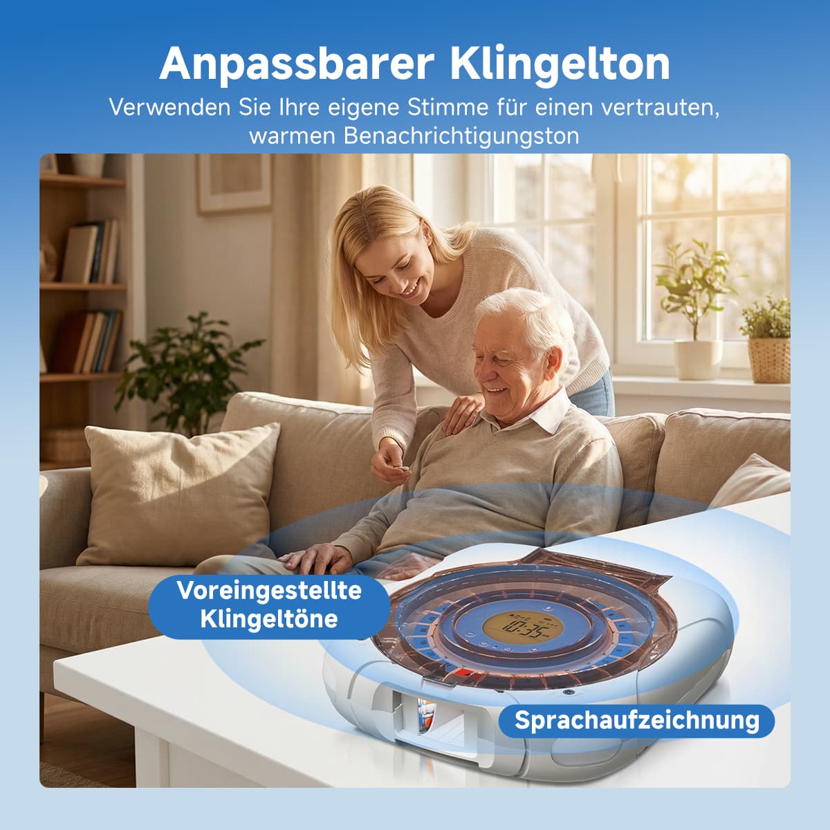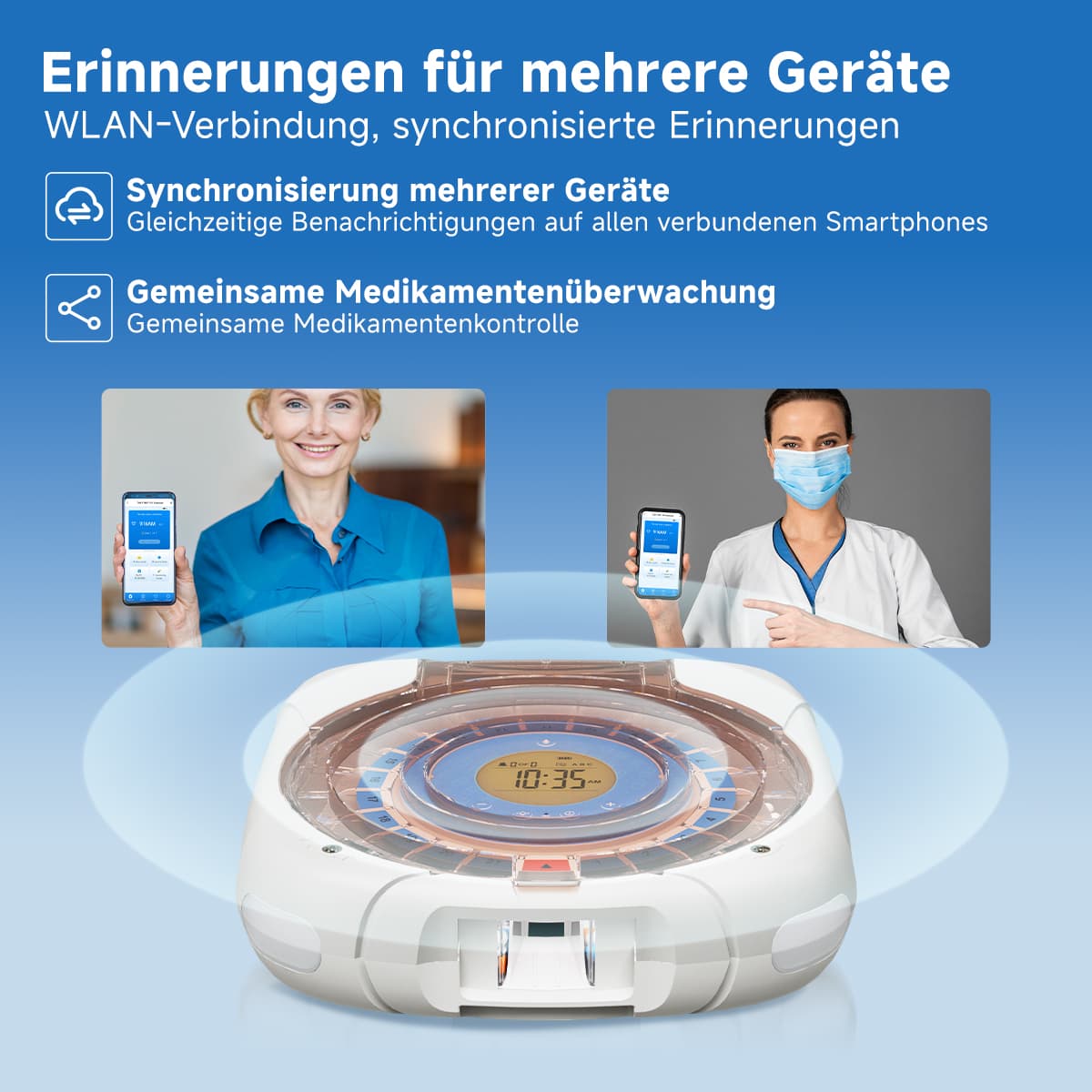 Das integrierte WLAN-Modul ermöglicht das Hochladen von Medikamentendaten, Dosierungszeiten und Erinnerungen an vergessene Dosen in Echtzeit in die Cloud und die Synchronisierung mit einer mobilen App. Die Box kann mit mehreren Apps gekoppelt werden, sodass Familienmitglieder die Einnahme bequem überwachen und eine nahtlose, gemeinschaftliche Pflege zu Hause gewährleisten können. Eine einzigartige Aufnahmefunktion ermöglicht individuelle Erinnerungstöne – der piepsende Ton wird durch eine vertraute Stimme ersetzt (z. B. eine freundliche Erinnerung eines Angehörigen), wodurch die Erinnerungen persönlicher und effektiver werden.