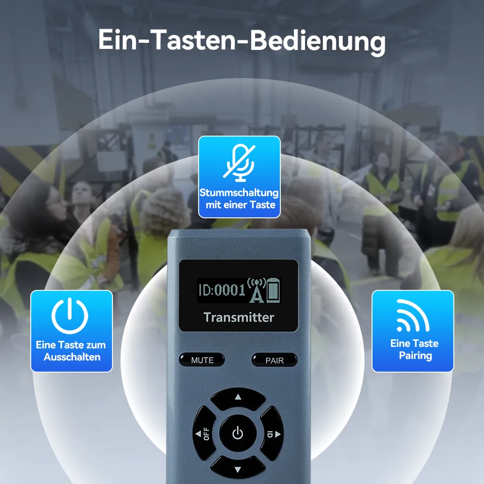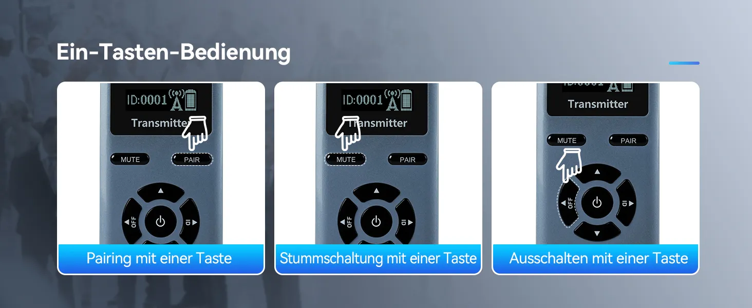 · Große Tasten mit Ein-Tasten-Bedienung: Sender und Empfänger per Knopfdruck koppeln; Sender per Knopfdruck stummschalten.
