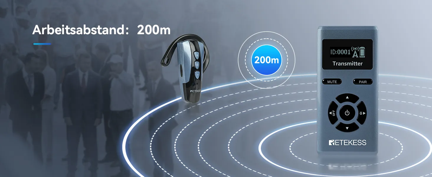· TDie Kommunikationsdistanz zwischen Sender und Empfänger beträgt 200 m und eignet sich somit für große Veranstaltungsorte (z. B. Freiluftattraktionen).