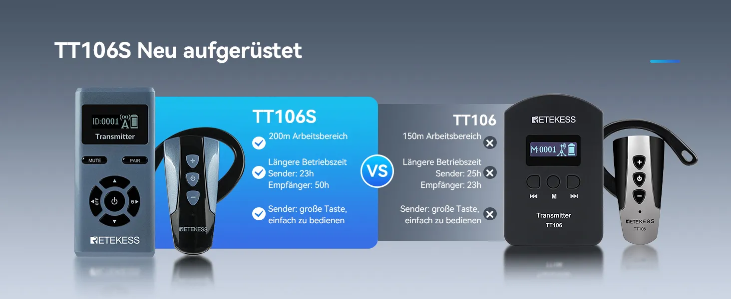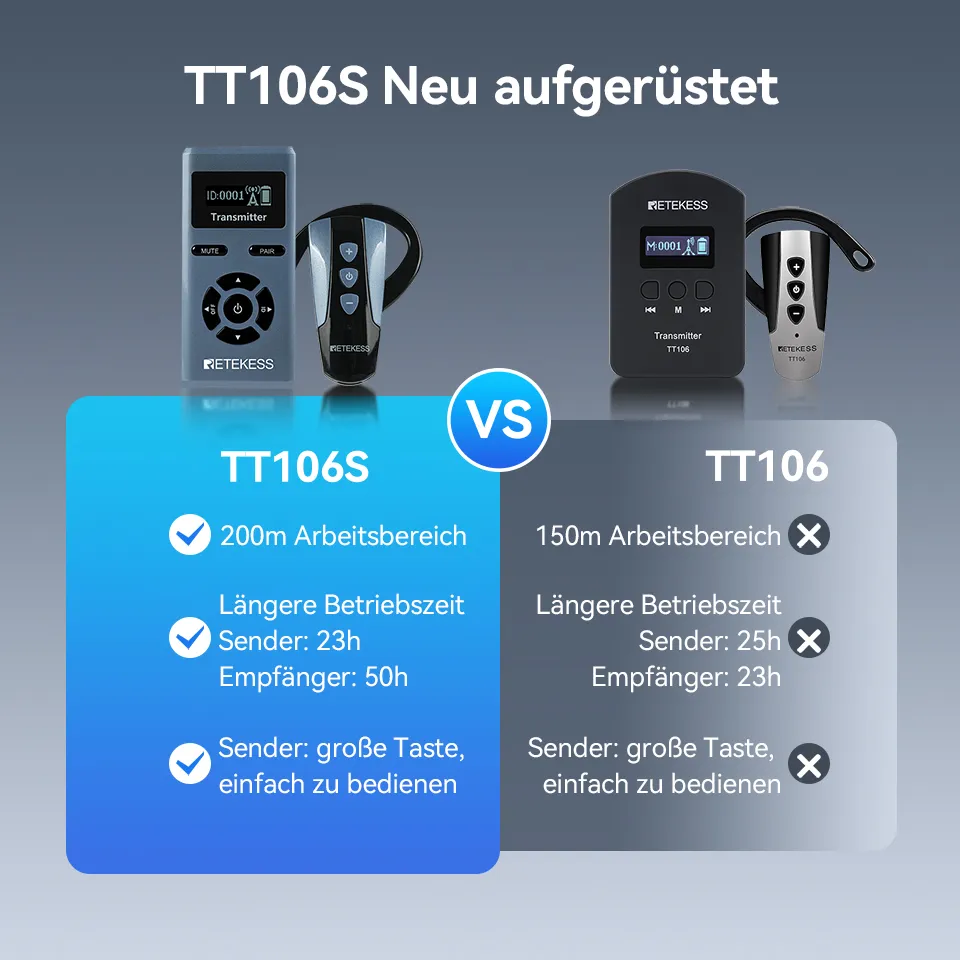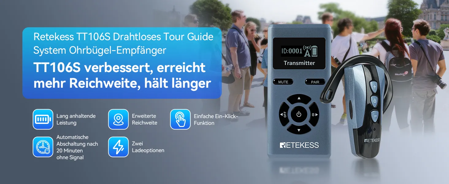 Das kabellose Headset-Tourguidesystem TT106S ist eine verbesserte Version des hochgelobten TT106. Dank des kabellosen Ohrbügels gehören Kabelsalat und damit lästige Kopfhörerkabel der Vergangenheit an, was Wartung und Handhabung deutlich vereinfacht. Es eignet sich ideal für diverse Anwendungsszenarien der drahtlosen Gruppenkommunikation, wie beispielsweise Führungen, Werksbesichtigungen, Schulklassen und Konferenzen.