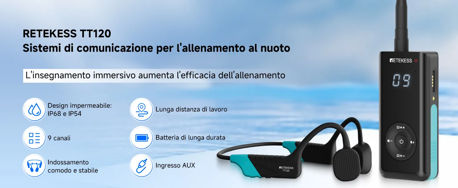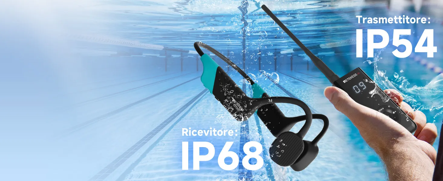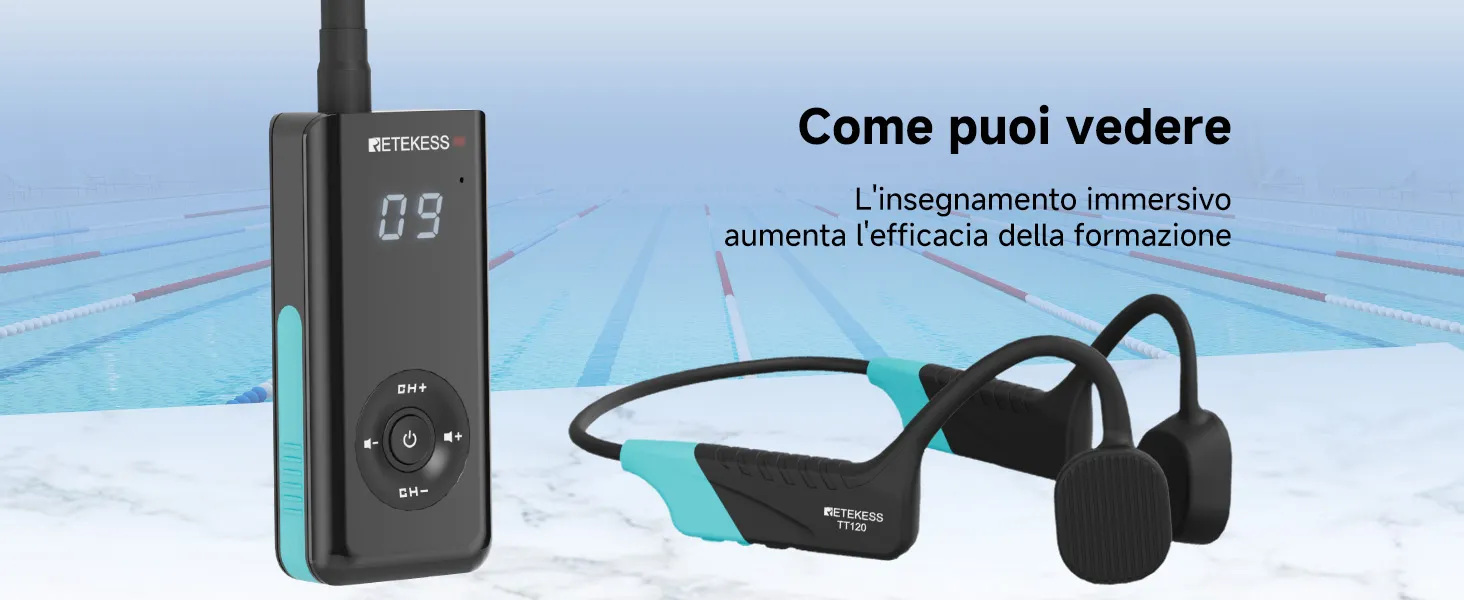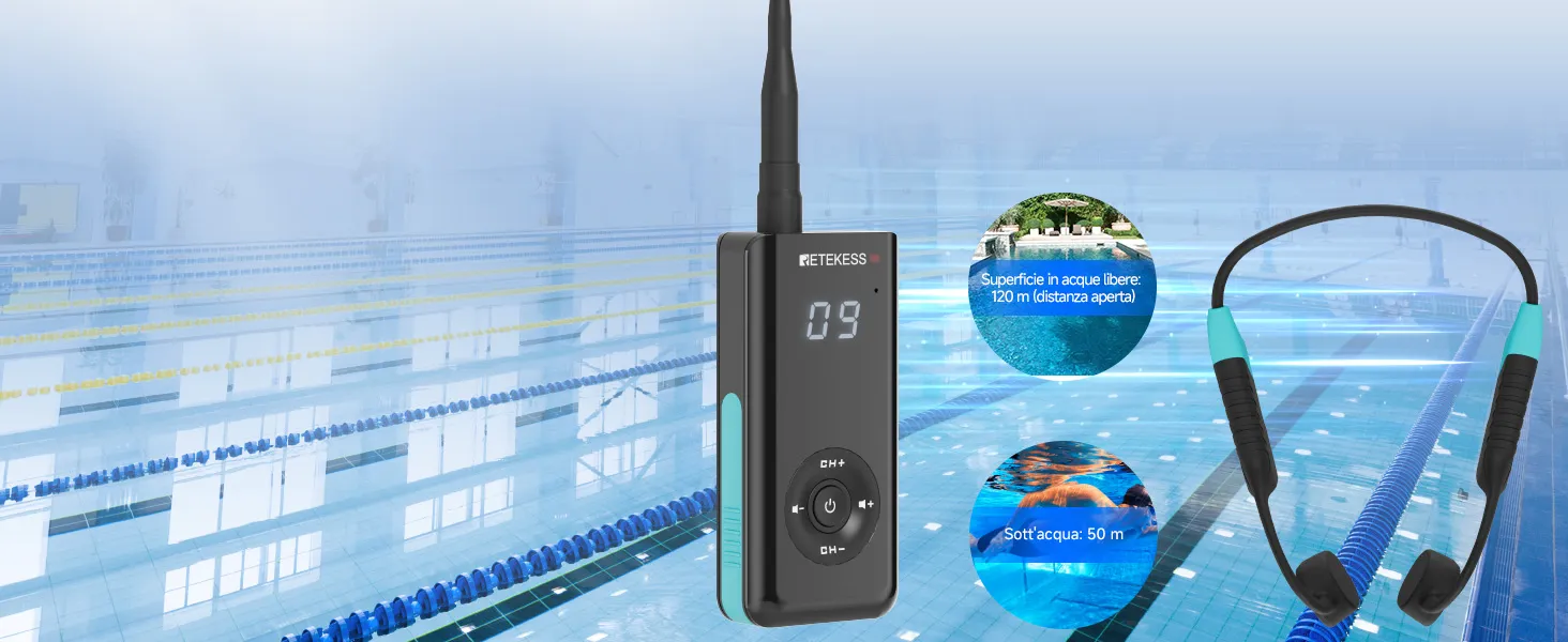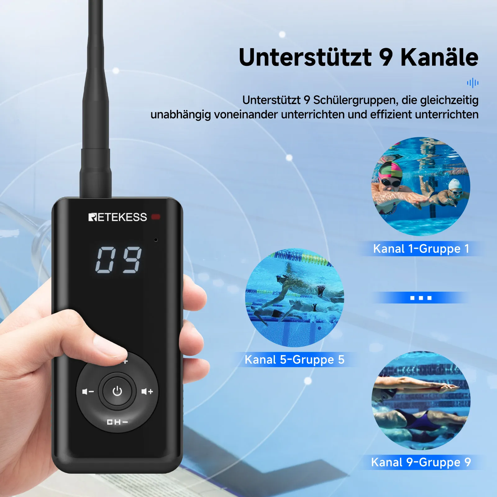 Das wasserdichte Sport-Intercom-System ermöglicht es bis zu neun Trainern, gleichzeitig in einem Becken Kurse zu geben. Alternativ kann ein Trainer neun Teilnehmern über separate Kanäle individuelle Anweisungen geben. Der Trainer kann auch über einen einzigen Kanal mit der gesamten Gruppe sprechen.