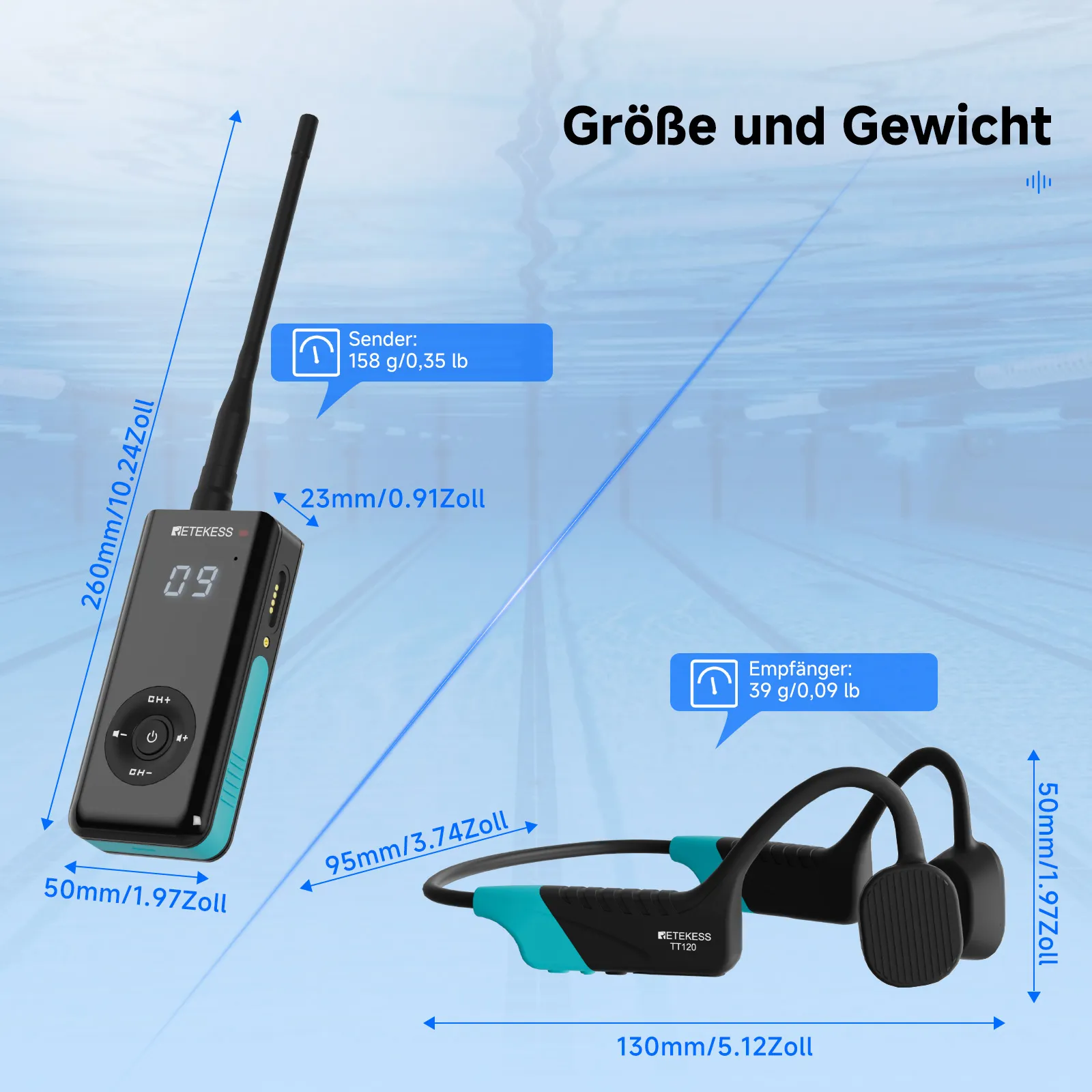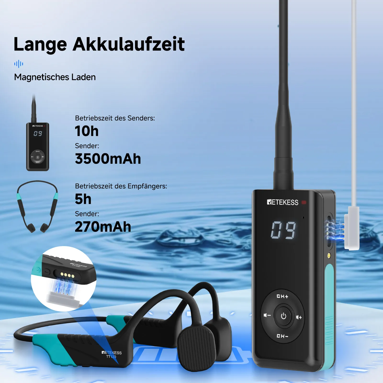 Der Empfänger nutzt Knochenleitung, sodass der Ton auch dann hörbar ist, wenn die Ohrhörer nicht im Ohr, sondern außerhalb des Ohrs (dort, wo das Ohrläppchen am Kopf anliegt) sitzen. Diese absolut sichere Methode der Tonübertragung ermöglicht es, den Anweisungen des Trainers zu folgen und gleichzeitig Umgebungsgeräusche wahrzunehmen. Ob sich der Empfänger über oder unter der Wasseroberfläche befindet – die Übertragung ist stets optimal.