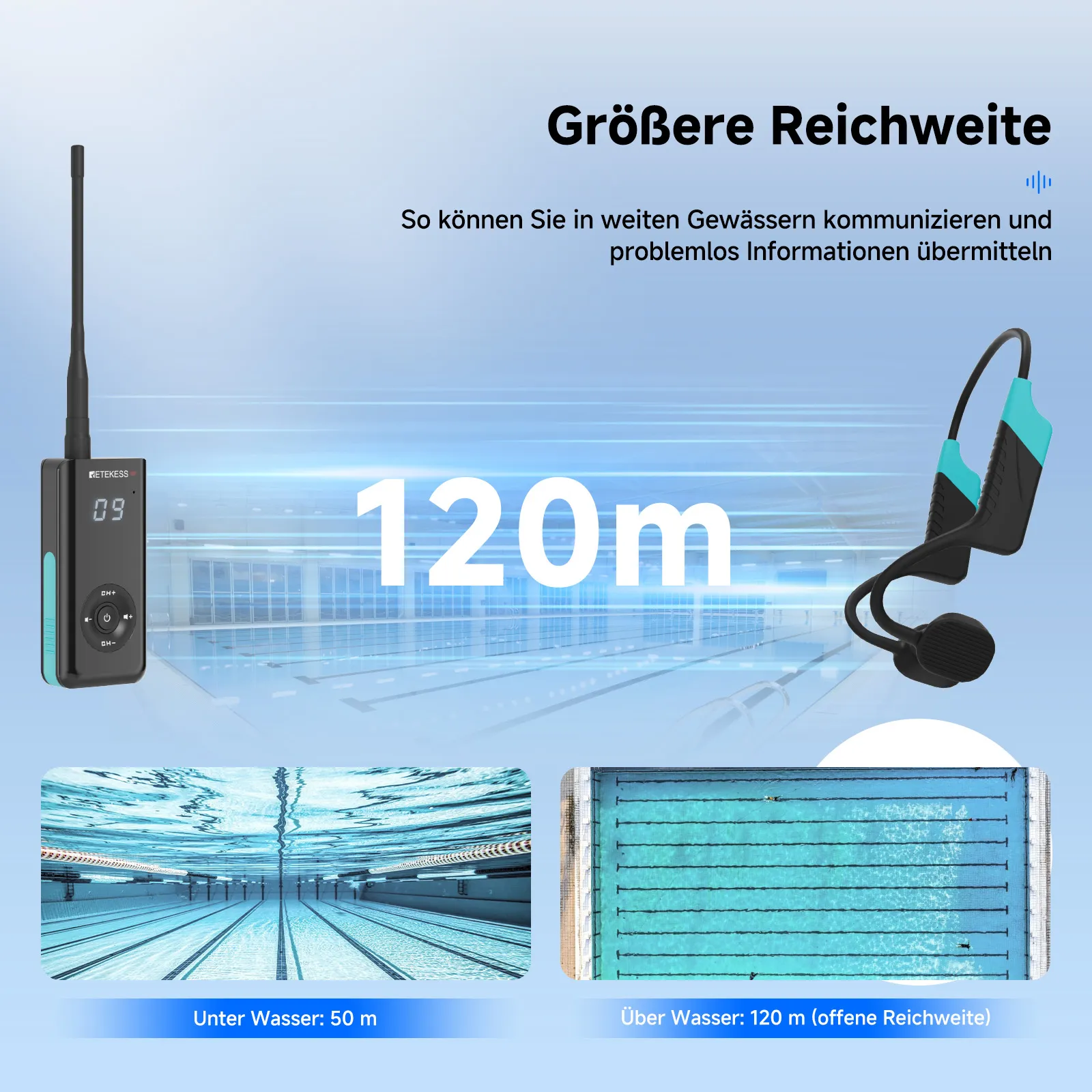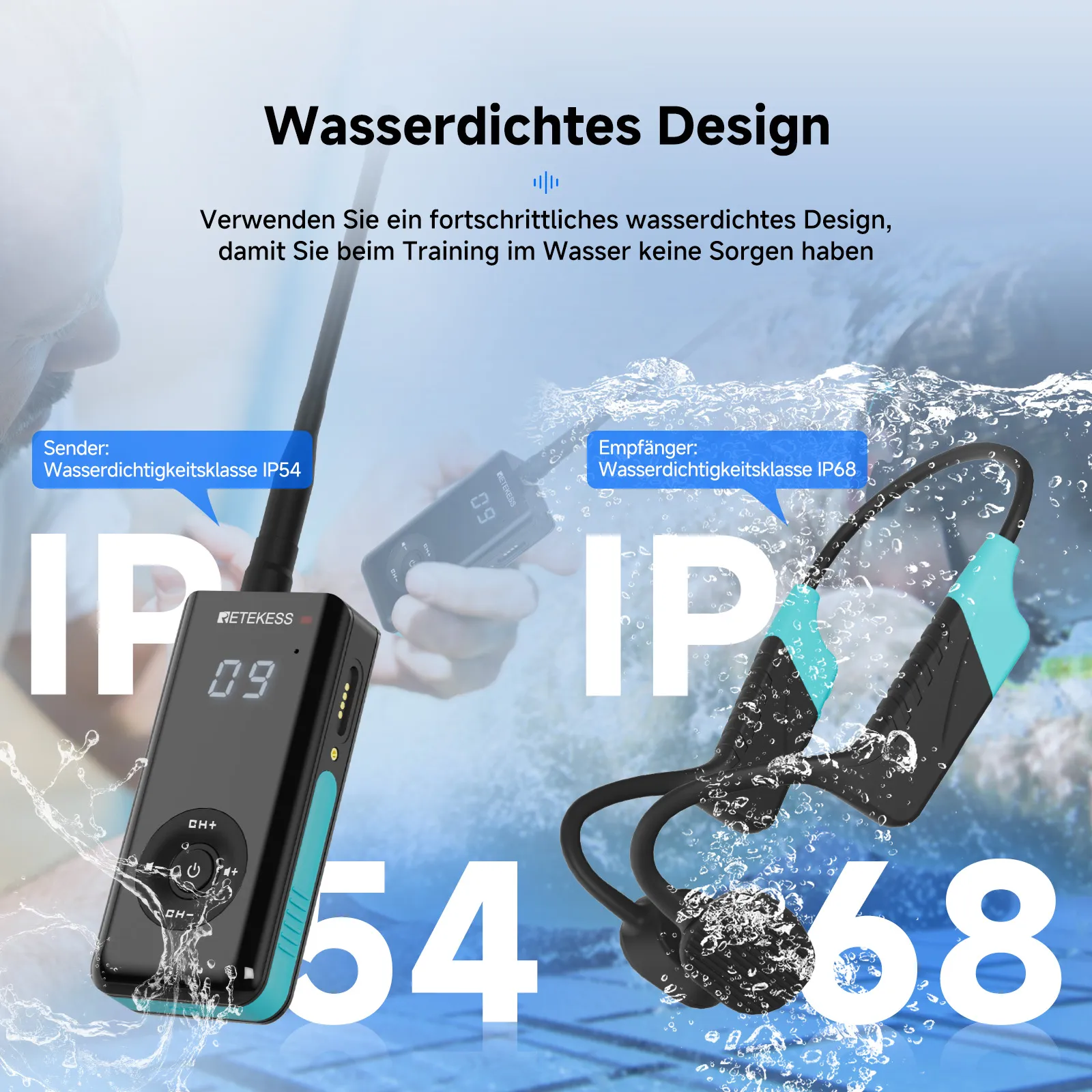 Das Schwimmtrainingssystem ist ein Funkgerät für Lehrer, Trainer, Athleten und Schüler, um auf dem Wasser zu trainieren. Trainer müssen nicht mehr schreien, um ihr Team anzuleiten. Es genügt, in normaler Lautstärke zu sprechen, und die Schwimmer hören Sie unter Wasser. So können Trainer die Schwimmer in Echtzeit korrigieren und ihnen helfen, das richtige Tempo zu halten. Das System ist absolut wasserdicht und eignet sich hervorragend für das Training von Wassersportlern wie Schwimmen, Windsurfen, Kitesurfen oder Stand-Up-Paddling.